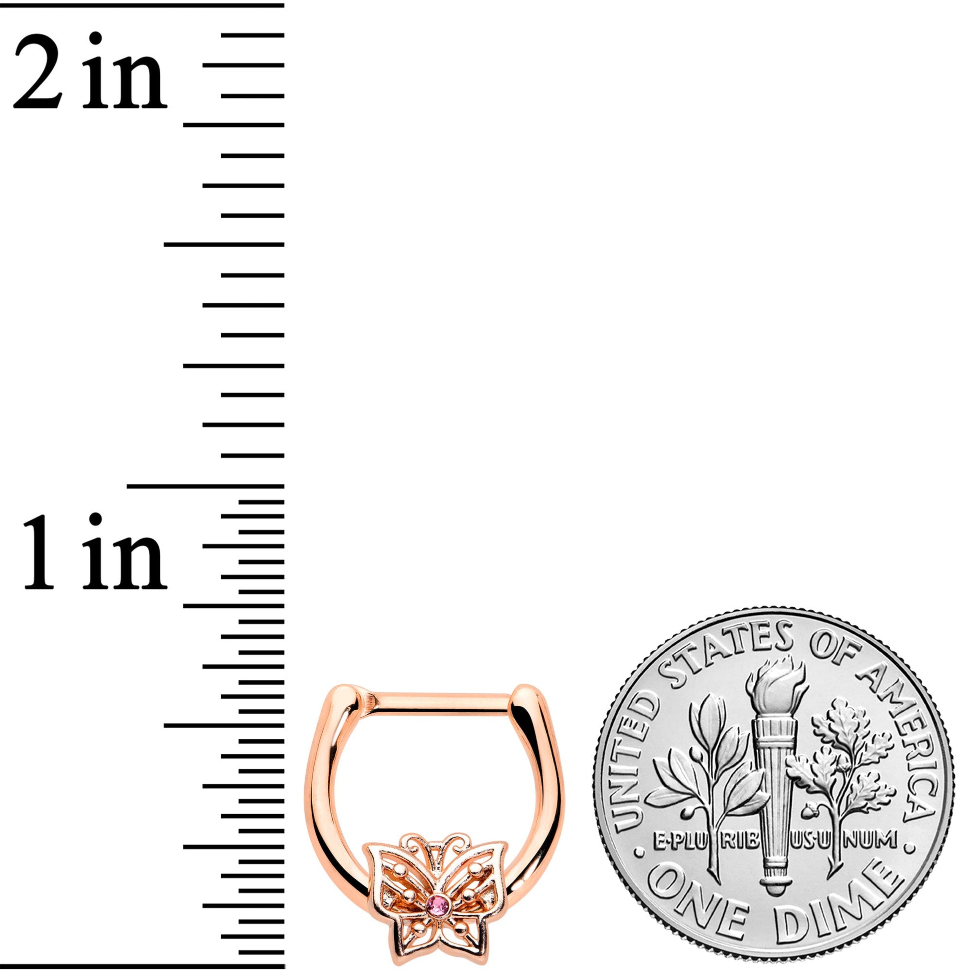 This 16 gauge cartilage ring has all the angles! It's made with an 8mm rose gold tone PVD over 316L surgical grade stainless steel hinged straight barbell. It features an angular, openwork butterfly charm. The butterfly is embellished with a pink cubic zirconia gem as well as a hinged clicker design that makes insertion and removal a snap. You can even boast this butterfly in multiple piercings including tragus, helix, and some conch piercings. This beautiful butterfly cartilage piercing jewelry is going to give you a whole new appreciation for geometry!Specifications