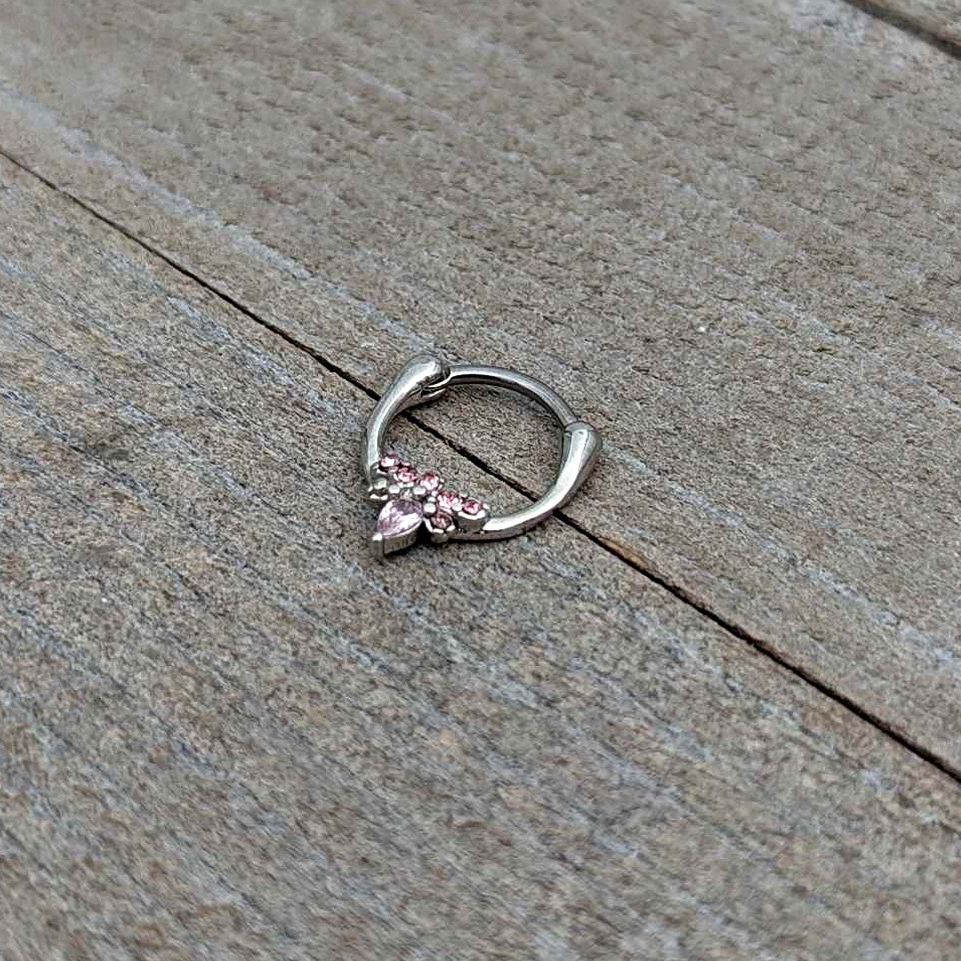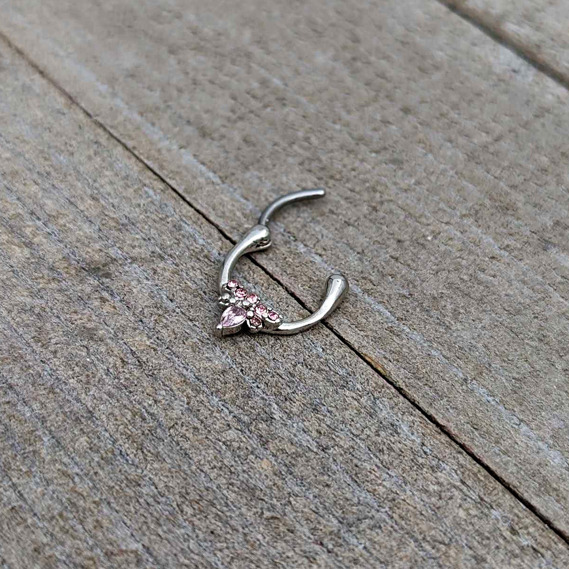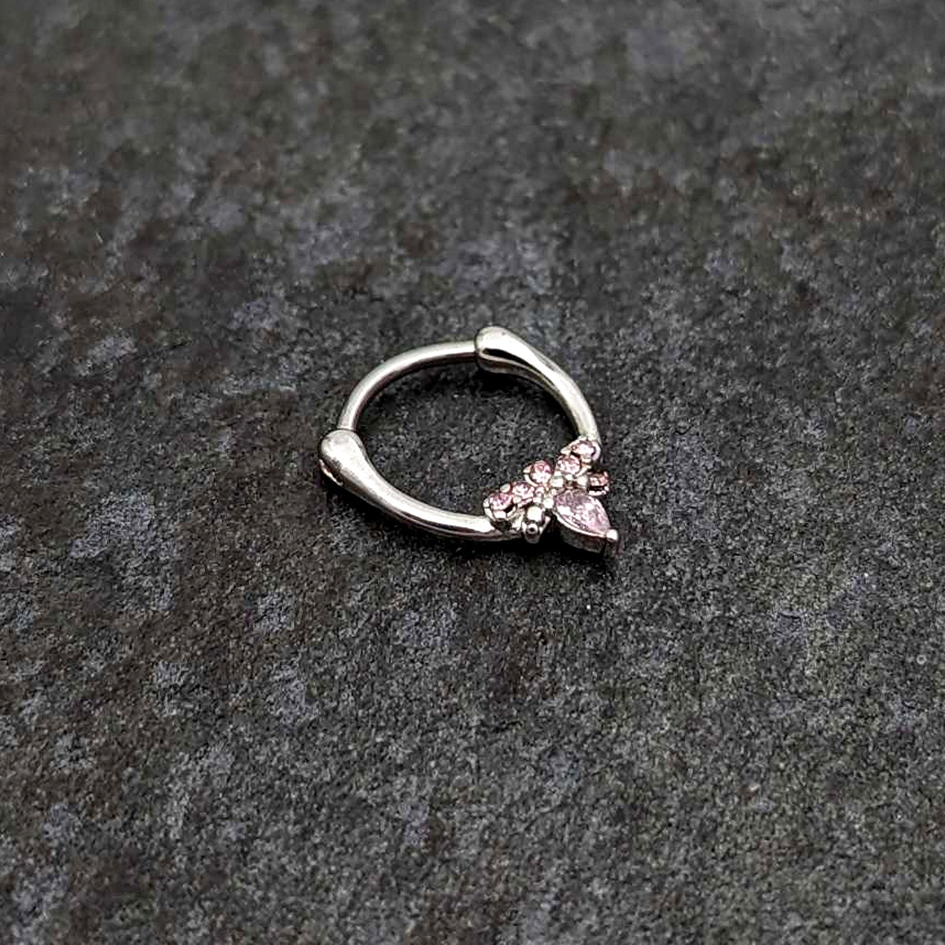The gorgeous style of this 16 gauge septum ring is sure to have everyone buzzing! It's made with an 8mm durable 316L surgical grade stainless steel hinged curved barbell. It features a bee charm with the wings set with pink gems and a pink gem body for added eye-catching flair. The hinged clicker design makes it a snap to insert and remove and you can also rock this bee in multiple piercings including tragus, helix, and some daith piercings. This honey of a cartilage ring will make your piercings the sweetest in the hive!Specifications