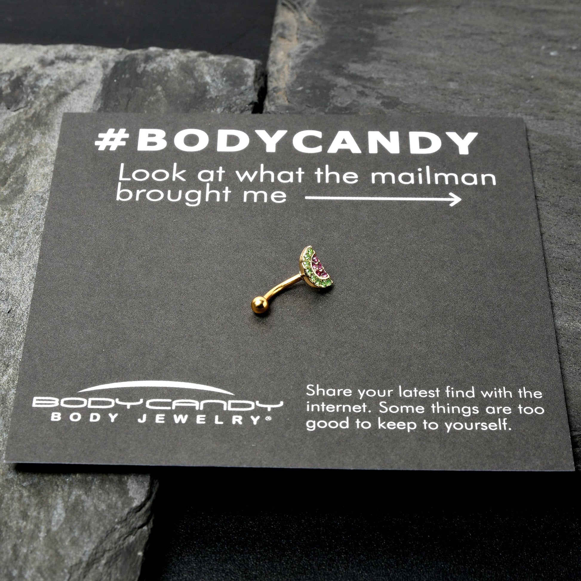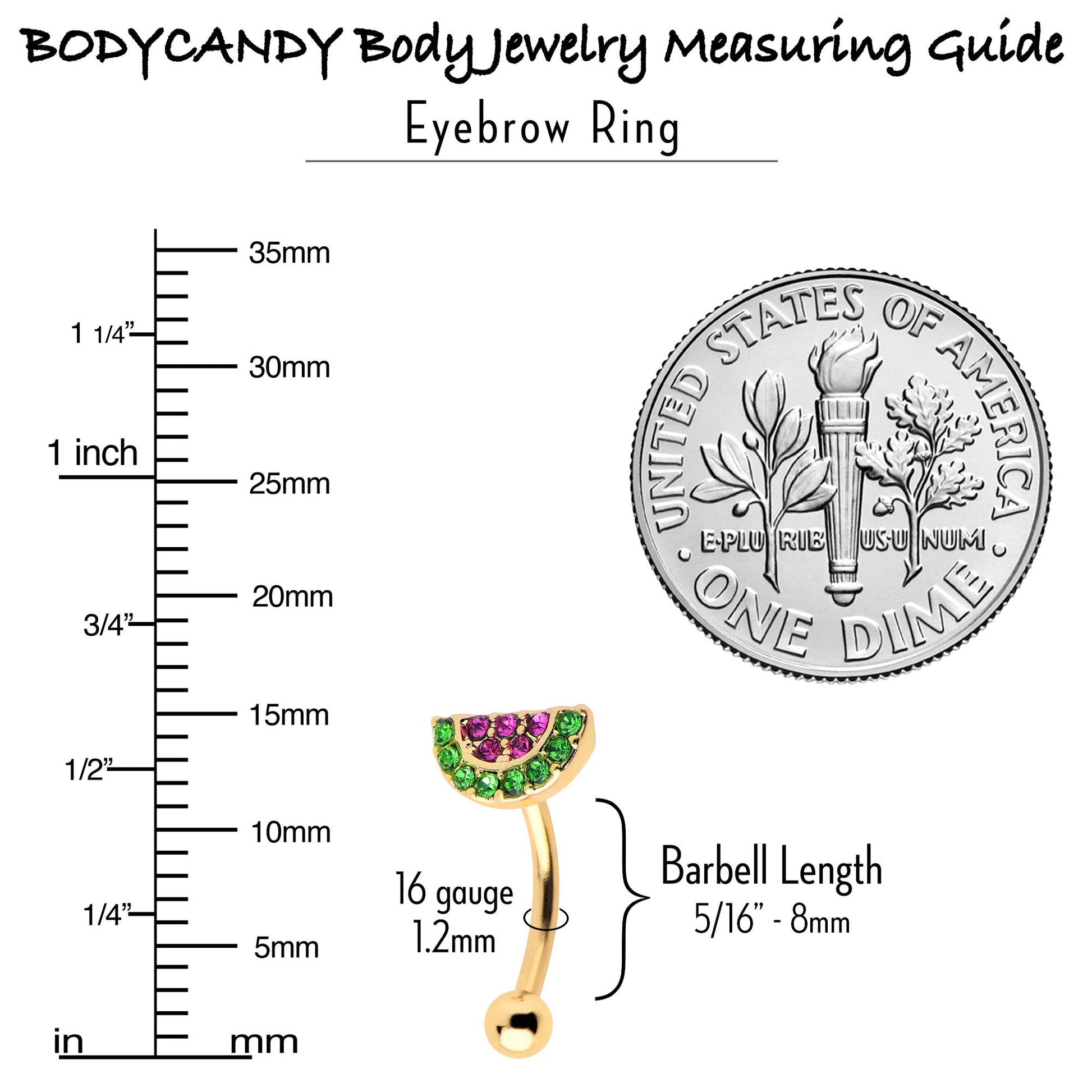 Your cartilage piercings will look downright delicious when you are wearing this 16 gauge eyebrow jewelry. It is made with an 8mm gold tone PVD over 316L surgical grade stainless steel curved barbell with a 3mm bottom ball end. The top end features a wedge of watermelon charm, paved in green and pink gems. You can wear this marvelous melon in multiple piercings including eyebrow, rook, and some daith piercings. Get a tasty summer look with this wonderful watermelon cartilage piercing ring.Specifications