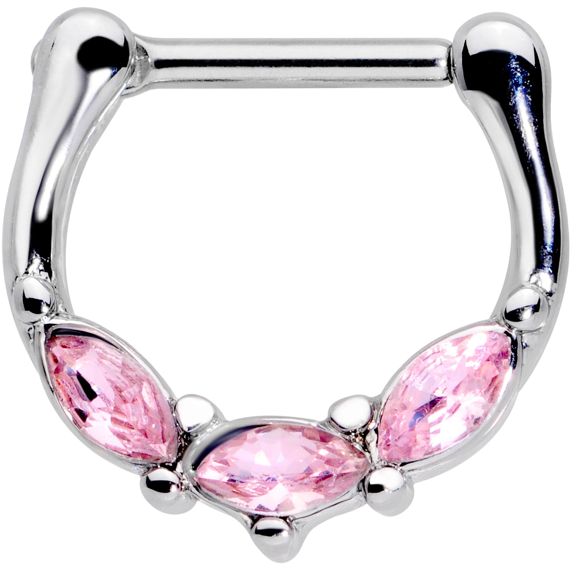 Add some simple color and sophisticated style to your piercings with this 16 gauge cartilage jewelry! It's made with an 8mm durable 316L surgical grade stainless steel hinged straight barbell. It features a trio of pink, oval gems for color and style that catch the eye without overwhelming it. The clicker design makes insertion and removal a snap and you can wear it in multiple piercings including tragus, helix, and septum. Add understated elegance to your look with this simple and stylish cartilage ring!Specifications