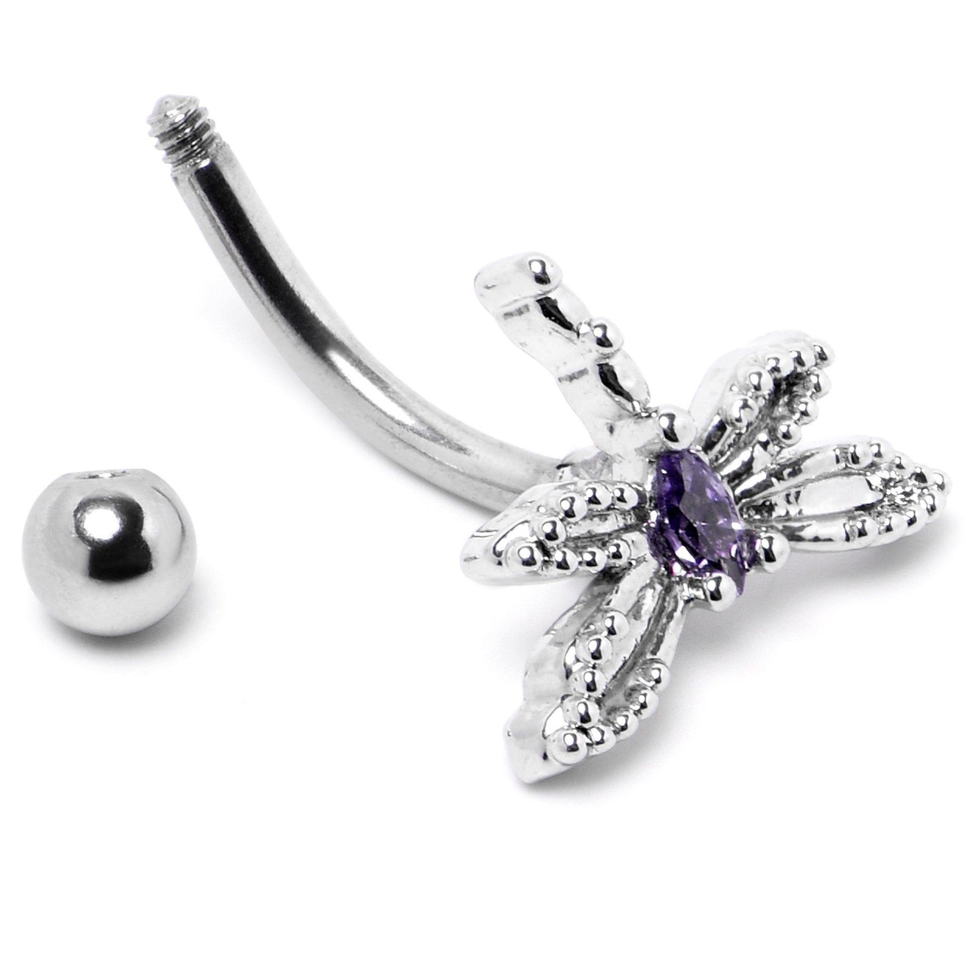 Let your piercings soar with style when you're rocking this 16 gauge eyebrow jewelry. It is made with an 8mm durable 316L surgical grade stainless steel curved barbell with a 4mm ball end. The top end features a dragonfly charm, with a purple cubic zirconia gem body. The wings are done in an openwork style and both wings and tails are embellished with textured detailing. You can even rock it in multiple piercings including rook, helix, and some daith piercings. Spread your wings and take flight with this dashing dragonfly cartilage piercing jewelry.Specifications