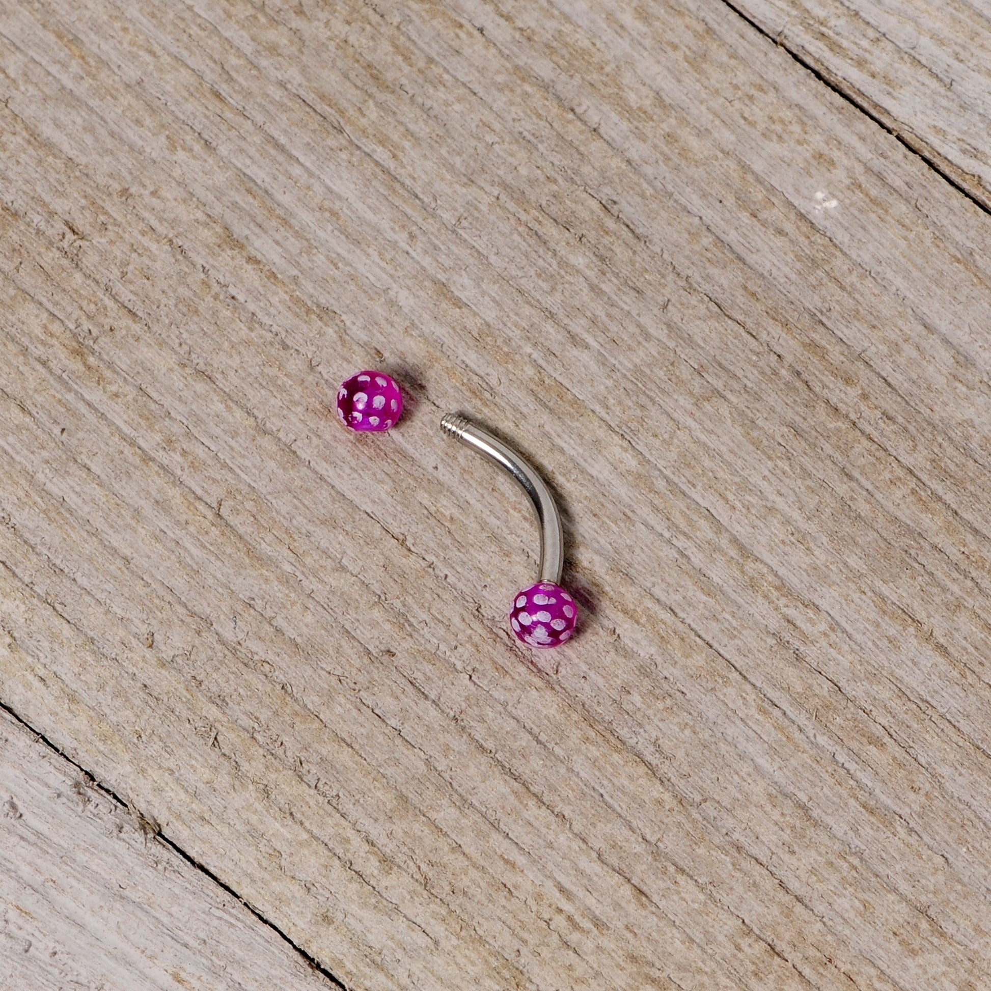 Light up the night when you're near a UV light with this 16 gauge curved body jewelry! It's made with an 8mm durable 316L surgical grade stainless steel curved barbell with 3mm ball ends. The purple acrylic ball ends are embellished with a pattern of white polka dots that glow under UV light. This eyebrow ring is just as eye-catching in any light with it's sweet and sassy style and works well in multiple piercings including your eyebrow and some lip piercings as well as cartilage piercings like your helix, tragus, rook, and daith. But now you can have an extra "glow" about you that will certainly have all eyes on you.Specifications
