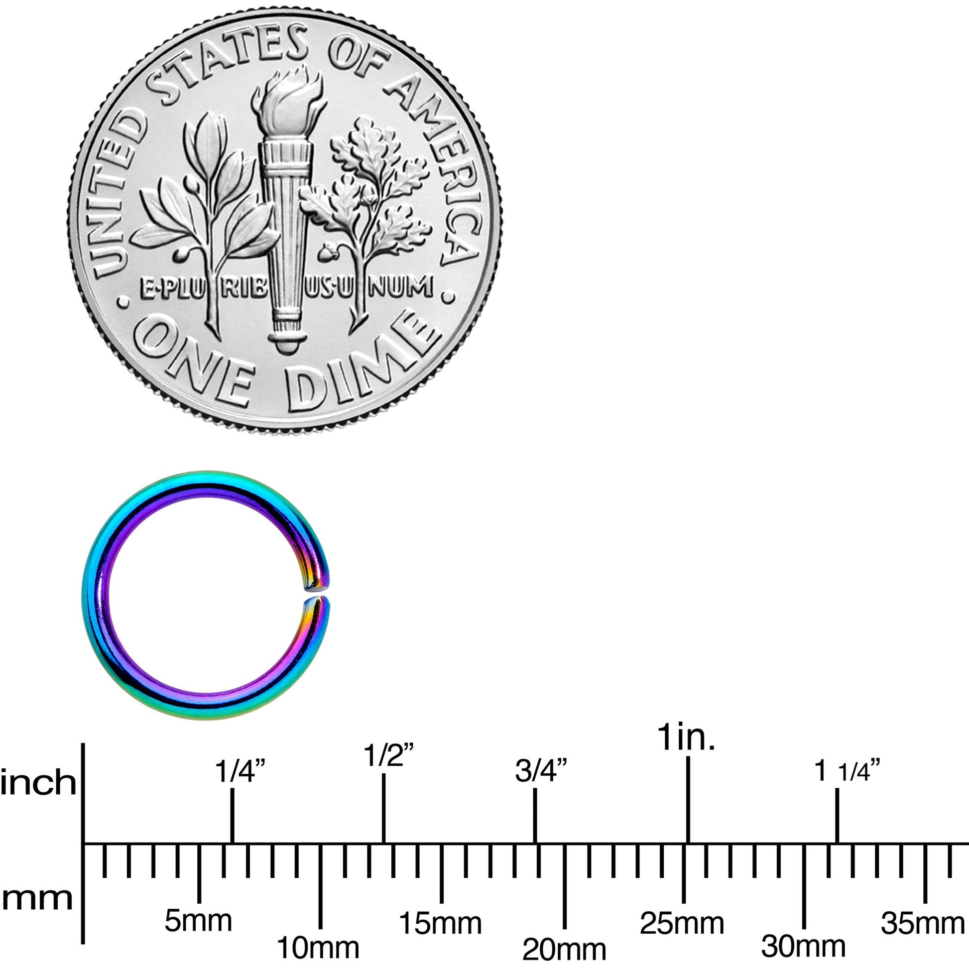 Whether you have multiple cartilage piercings and prefer a matching look or are simply prone to losing things, this set of 16 gauge cartilage rings has you covered. They're made with 8mm rainbow anodized over 316L surgical grade stainless steel circular rings for a colorful and comfortable feel. This cartilage jewelry is super easy to insert and remove - simply twist the ring open, insert, and then twist gently shut again. And you can rock these rings in multiple piercings including lip, helix, tragus, daith, rook, some eyebrow piercings, and stretched lobes! Sold as a set of twelve.Specifications