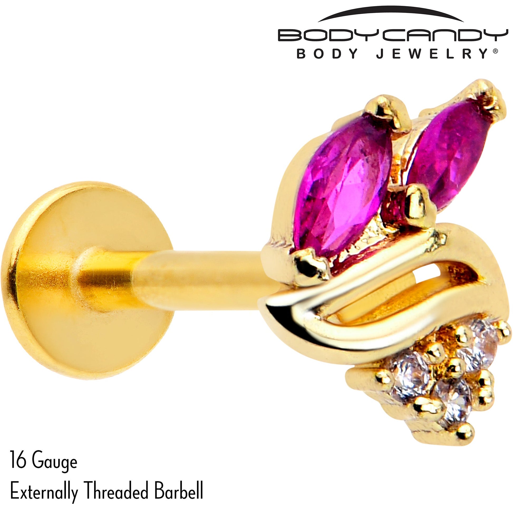 You're sure to be a fan of this 16 gauge lip ring. It's made with an 8mm gold tone PVD over 316L surgical grade stainless steel straight post with a flat disc end. It features a pair of red cubic zirconia gems fanned out and set above a swirl embellishment. At the base are clear cubic zirconia gems for an added touch of style. You can even rock it in multiple piercings including lip, monroe, tragus, helix, and some conch piercings. This cartilage piercing jewelry has so much glamour it'll make your head swirl.Specifications