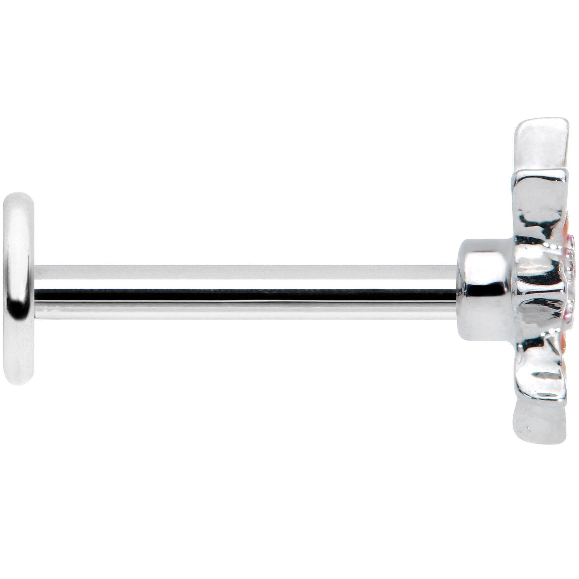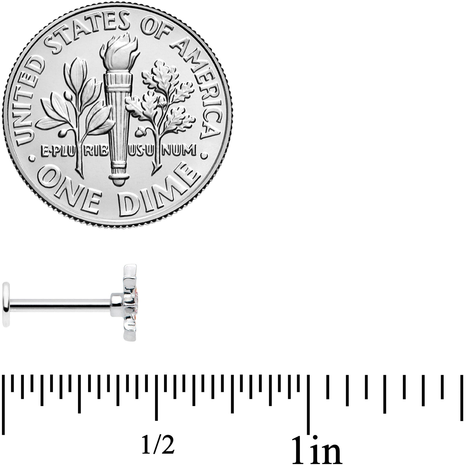 This 16 gauge lip ring is sure to bring some bright cheery color to your look! It's made with an 8mm durable 316L surgical grade stainless steel straight barbell, with a flat disc end. It features a flower charm with simple, clean lines. It's inlaid in red, orange, and yellow for a warm and cheerful appearance. You can even flaunt this flower in multiple piercing including lip, monroe, tragus, helix, and some conch piercing. Let your cartilage piercings blossom with this upbeat, cheerful floral cartilage jewelry!Specifications