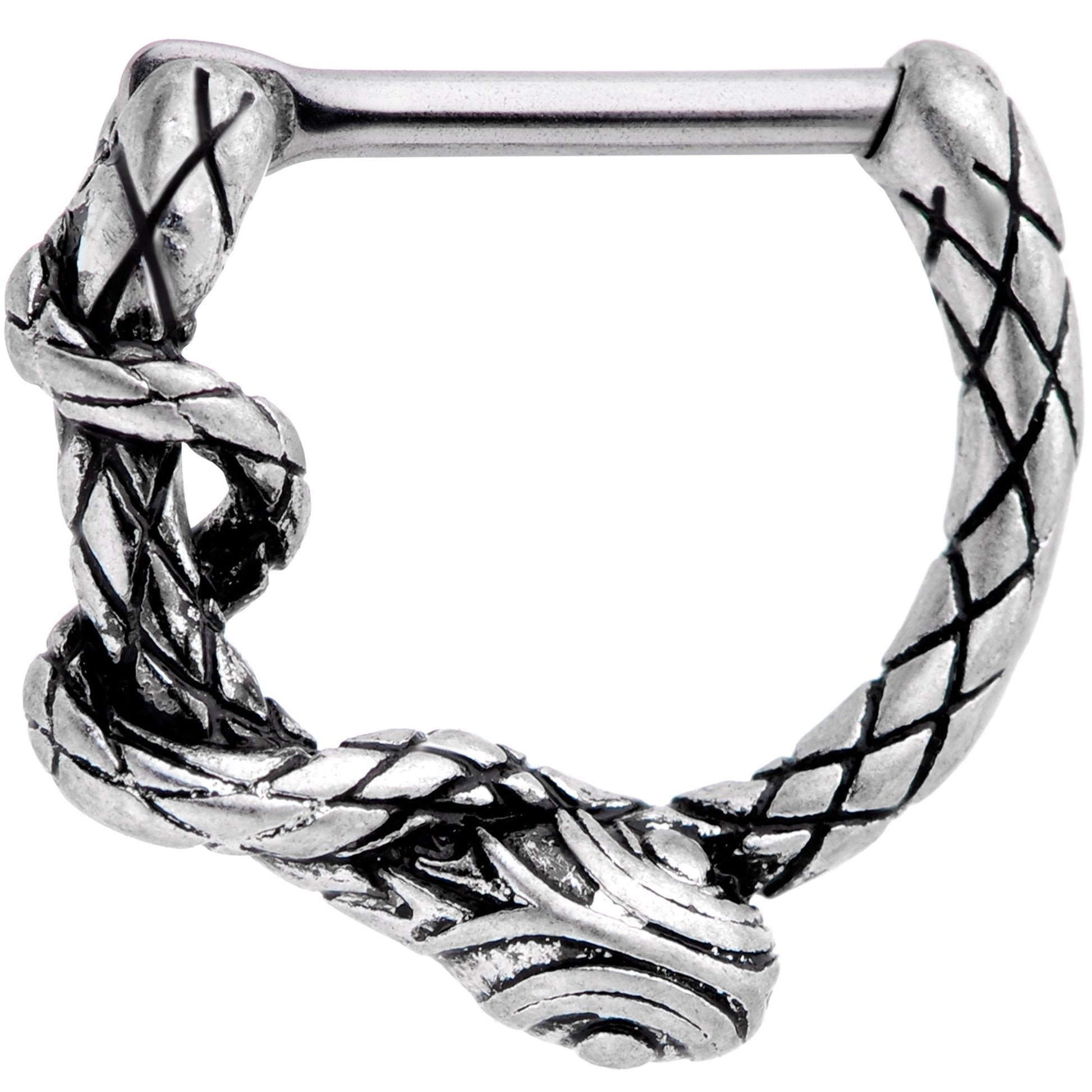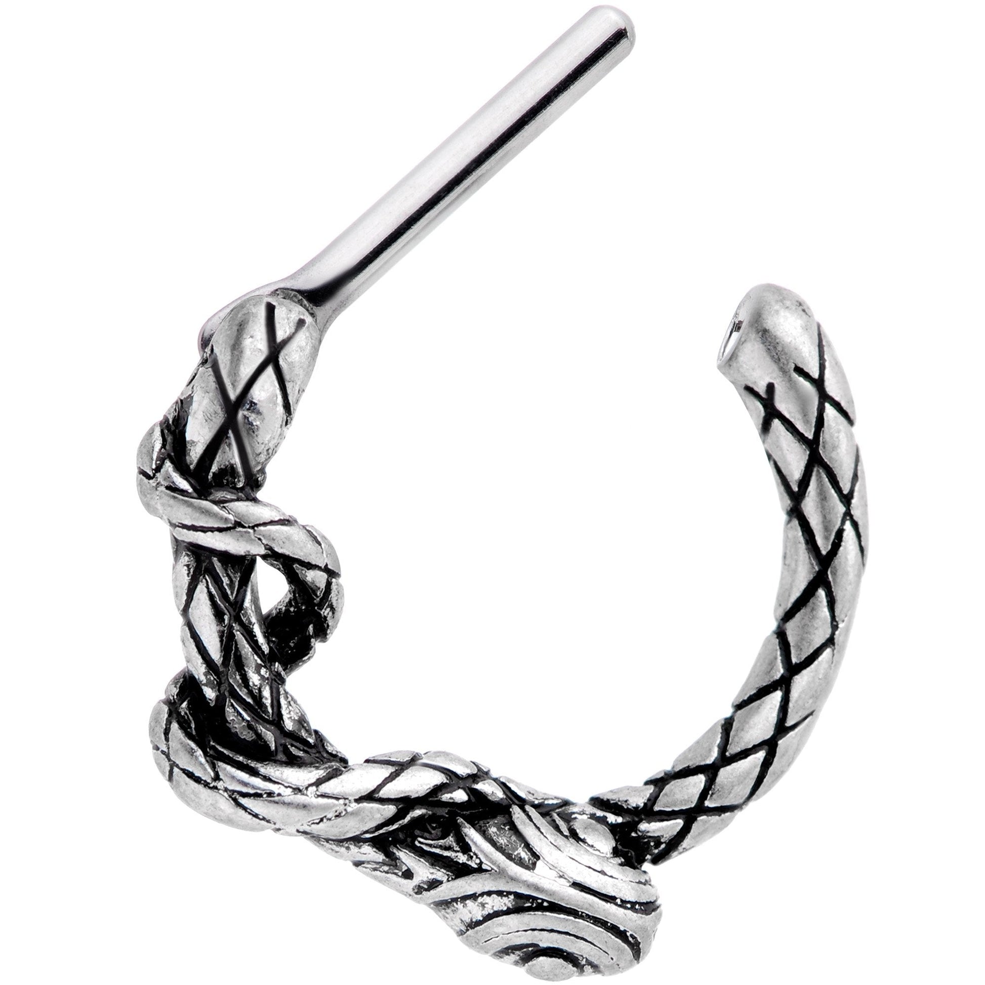 Don't be afraid of this slithering serpent, it just wants to hang around from your septum piercing! This 16 gauge septum clicker is made with an 8mm durable 316L surgical grade stainless steel straight barbell and features our sweet scaly snake. This ring features a hinged clicker design to make it super easy to insert and remove. But why would you want to remove it? This reptile romantic has so much love to offer you! And it works in cartilage piercings like the helix and tragus as well as the septum.Specifications