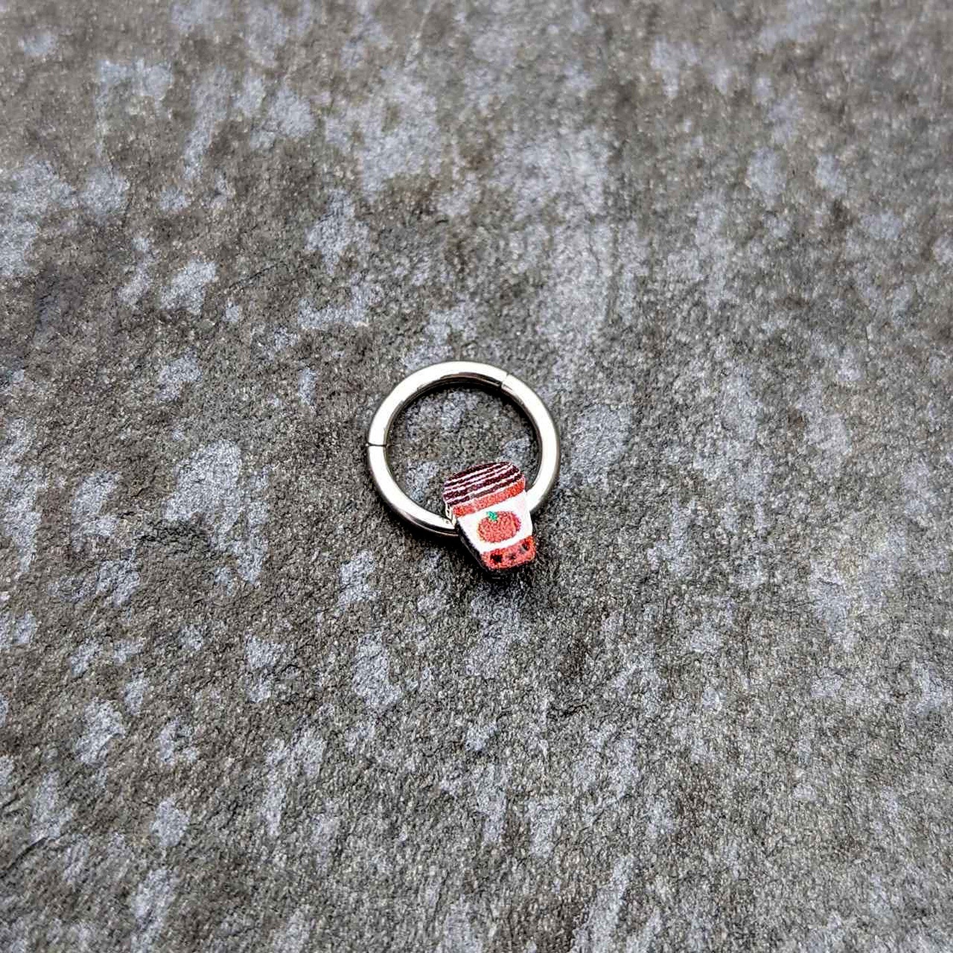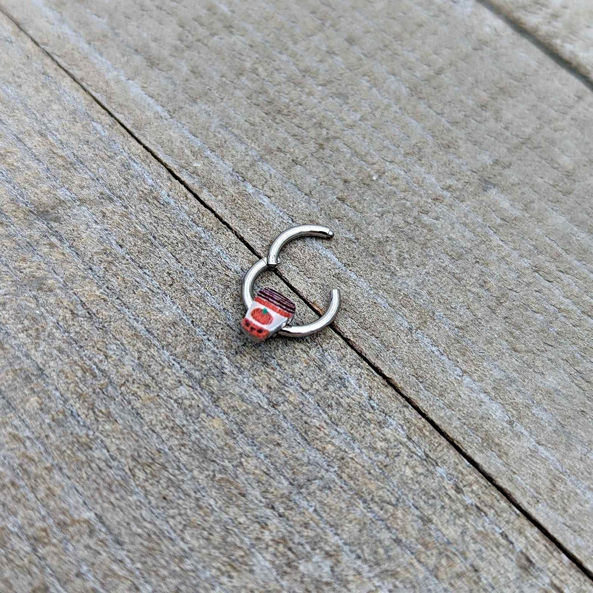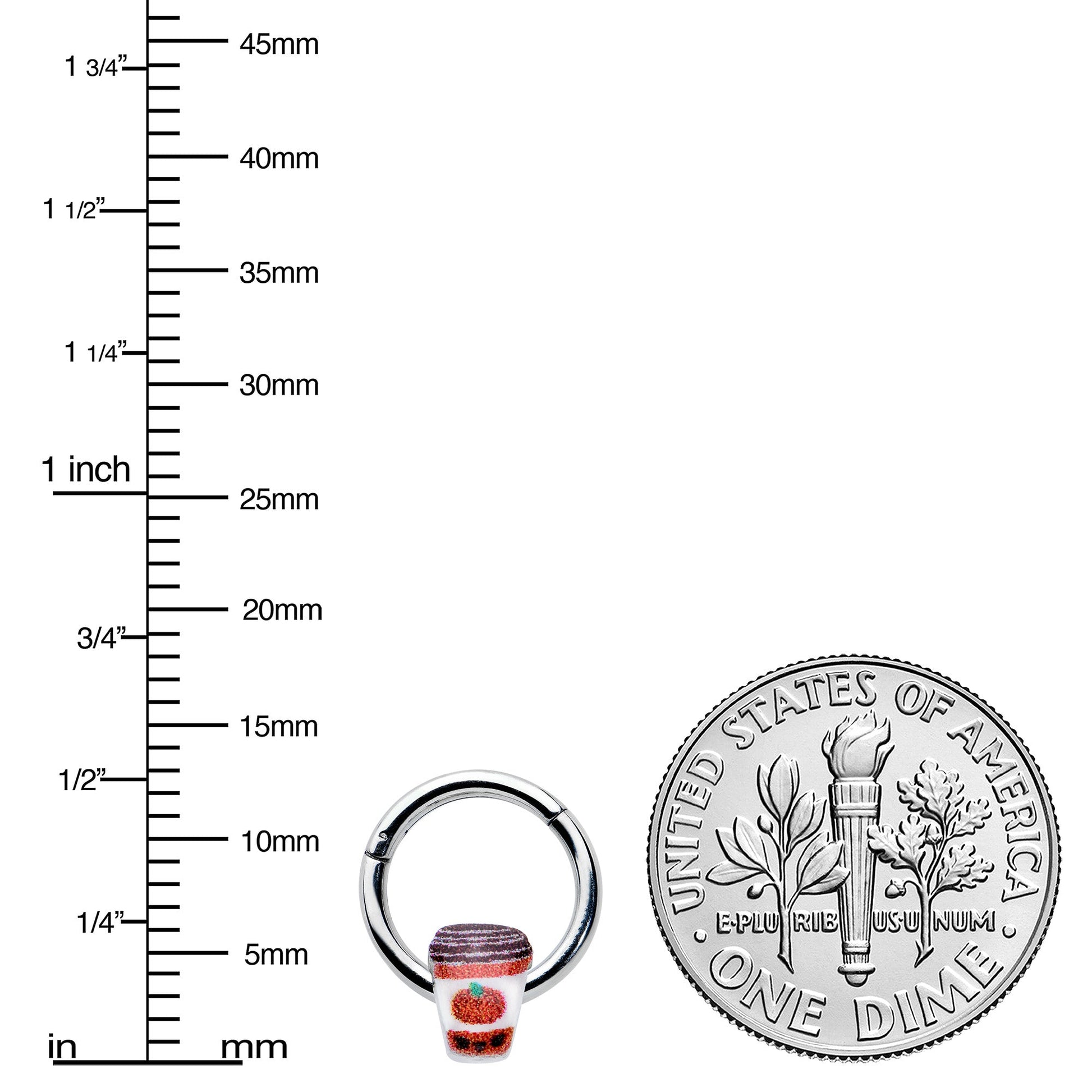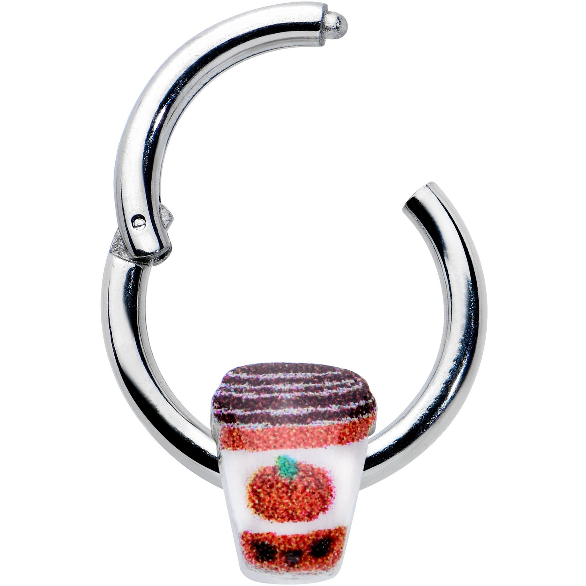 This is one sweet treat you won't want to eat, when you're rocking this 16 gauge helix ring! It's made with an 8mm durable 316L surgical grade stainless steel hinged circular ring. It features a kawaii-inspired pumpkin latte charm, inlaid in Fall colors and sporting a pumpkin on its label. It also features a non-removable, hinged segment that makes insertion and removal a breeze and you can even rock it in multiple piercings including tragus, helix, and some daith piercings! Get a hot look during the cold days of fall with this yummy pumpkin latte cartilage jewelry!Specifications