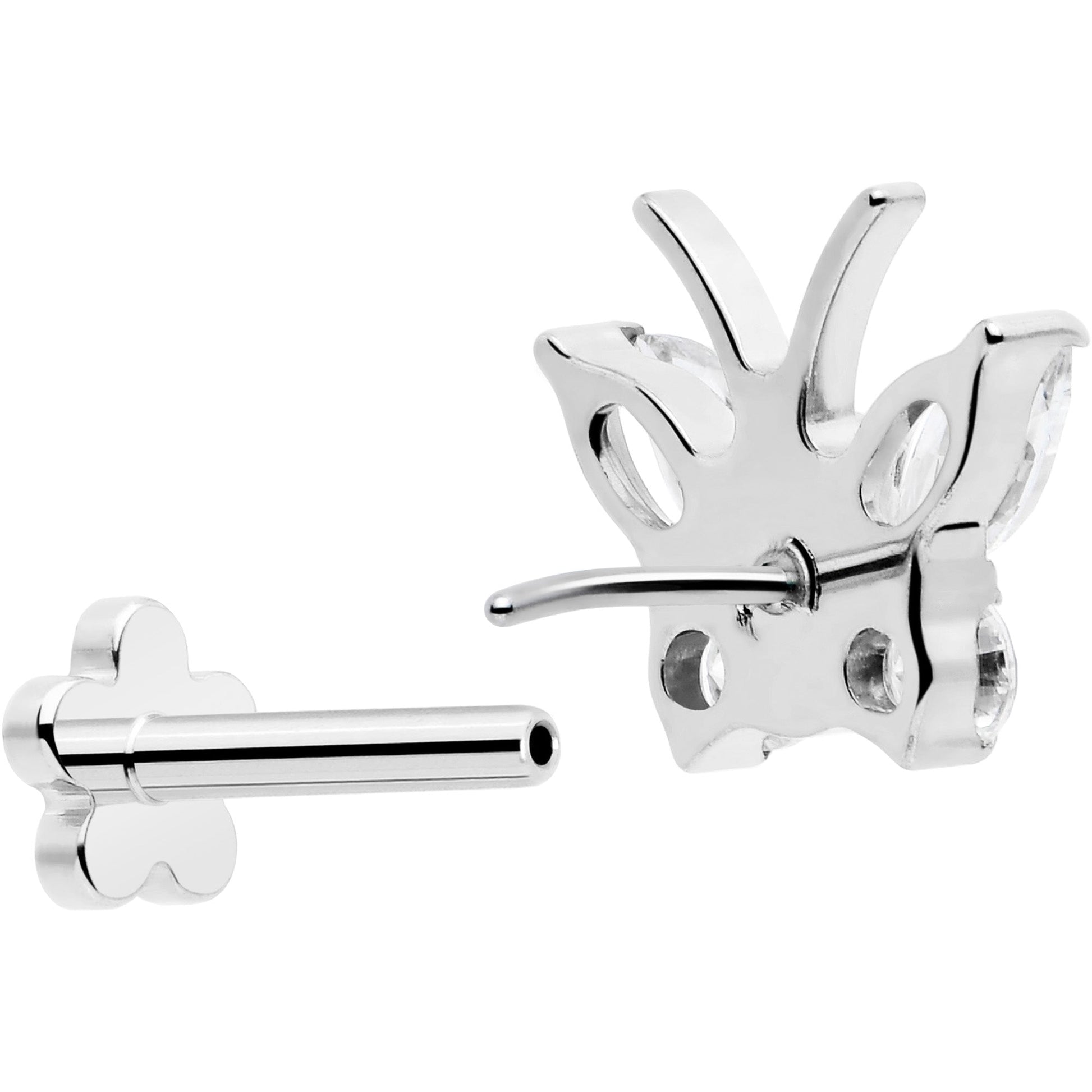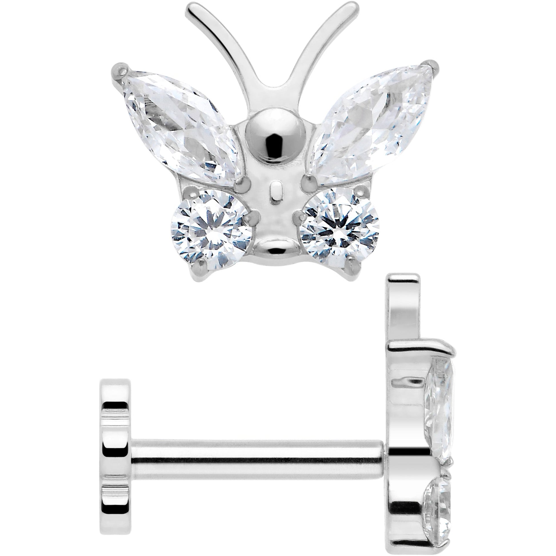 It's your time to metamorphose into style with this 16 gauge lip ring. It is made with an 8mm ASTM F-136 implant grade titanium straight post with a flat disc end. The front end features a butterfly charm which is set with clear gems while the back end is a flower shape for double the looks in one one piece of jewelry. It also features a threadless design for maximum comfort on insertion or removal and you can even rock it in multiple piercings including lip, monroe, tragus, helix, and some conch piercings. Get glam two times over with this reversible butterfly and flower cartilage piercing jewelry.Specifications