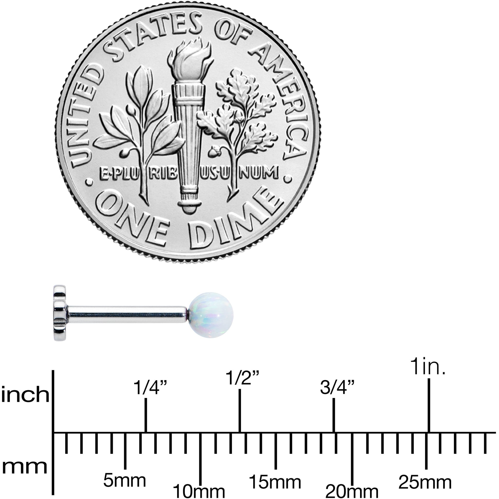 Your cartilage piercings will have twice the style with this 16 gauge lip ring! It's made with an 8mm solid grade 23 implant grade titanium straight barbell. The front end features a 3mm white synthetic opal ball end and a threadless design that makes insertion and removal a snap! The back end features a flower shape, for a charming change from the standard disc shape. You can even rock this jewelry in multiple piercings including lip, monroe, tragus, helix, and some conch piercings. With such an endearing style and such thoughtful details, this is one cartilage ring you'll never want to remove!Specifications