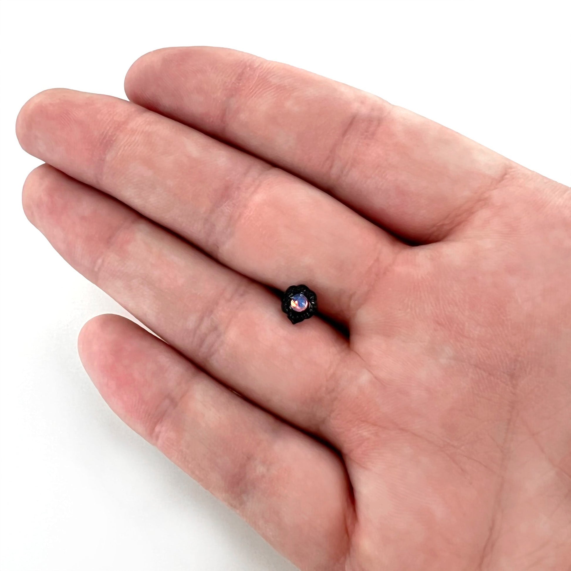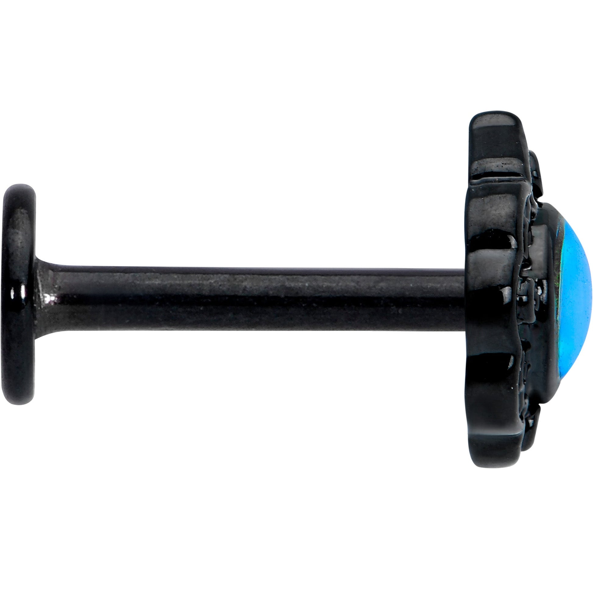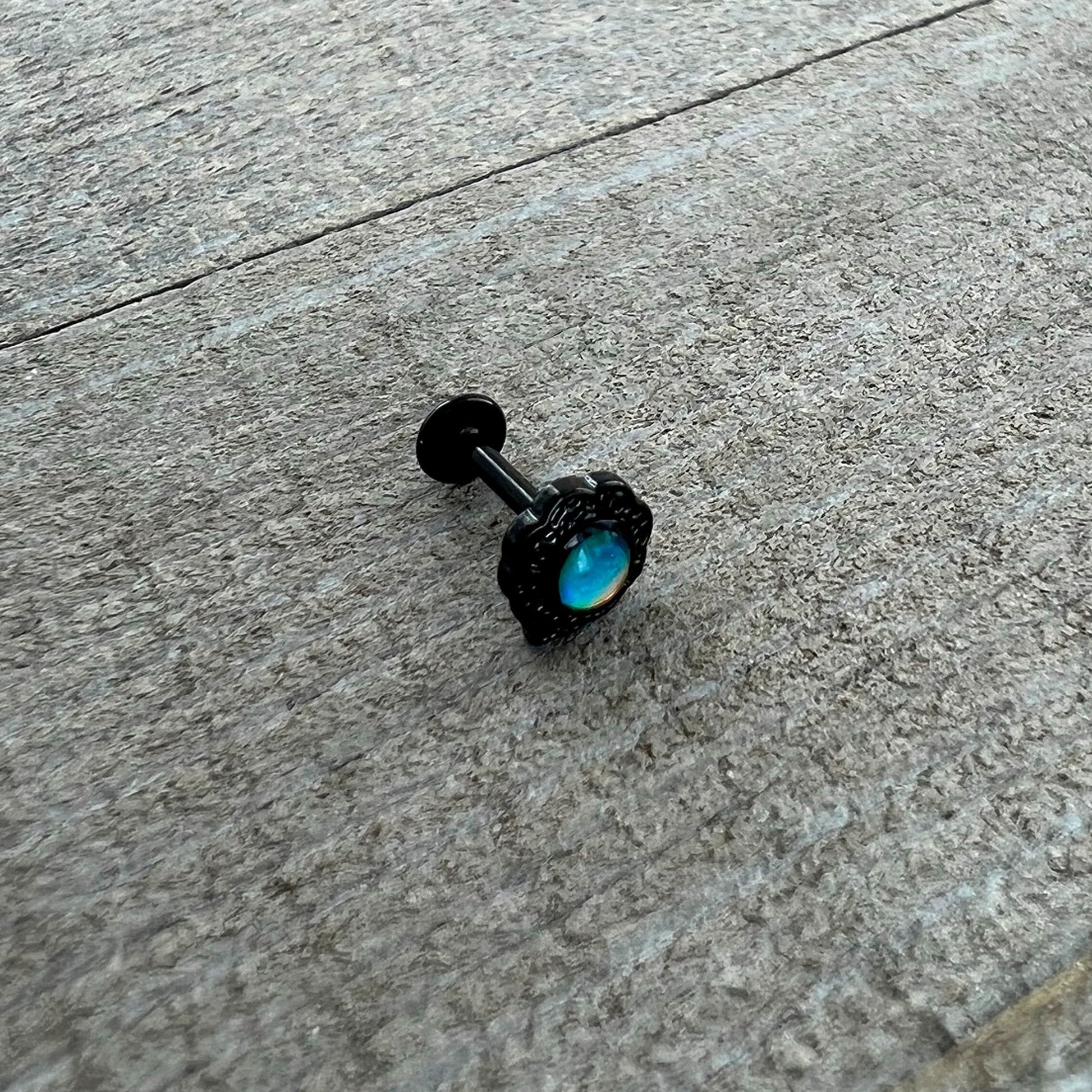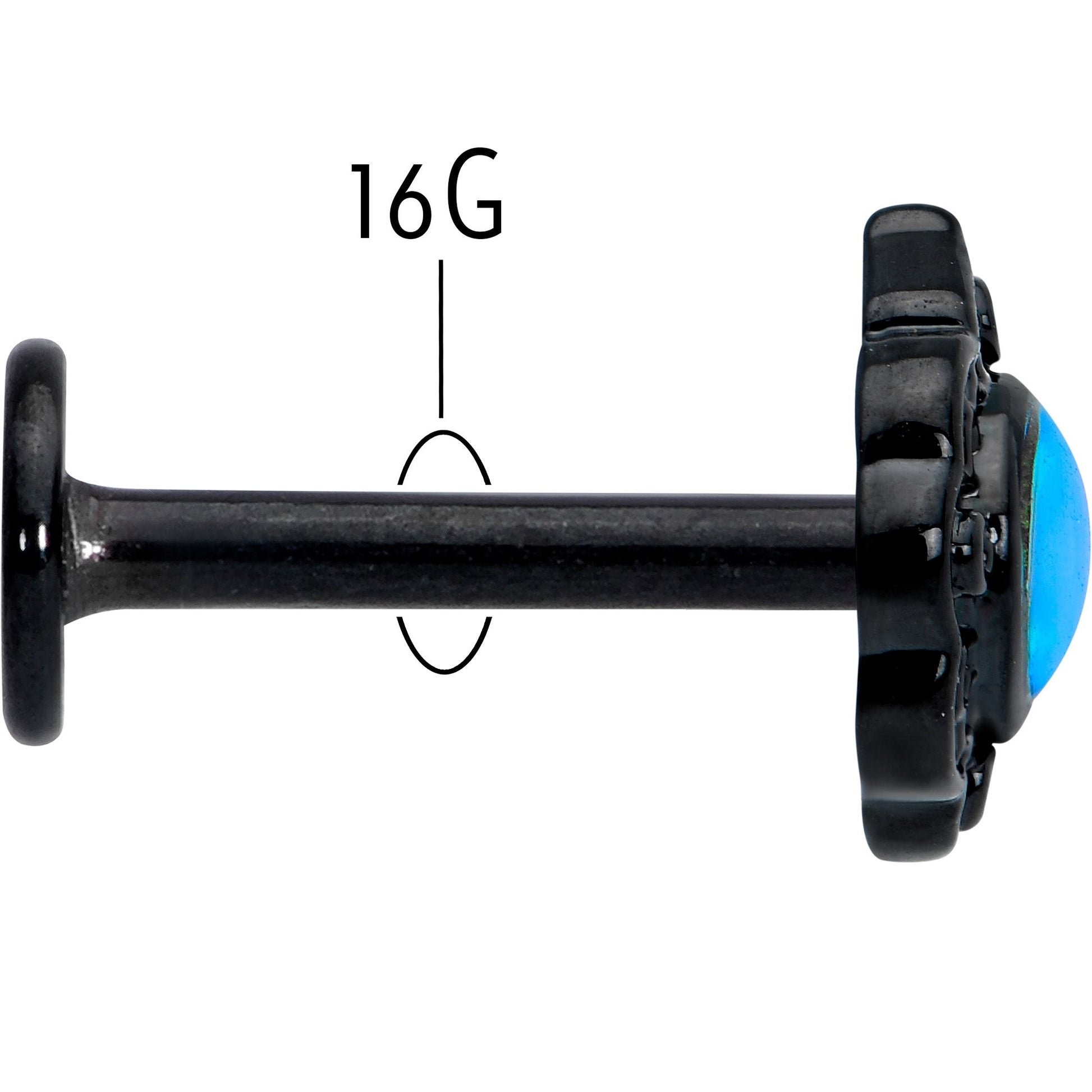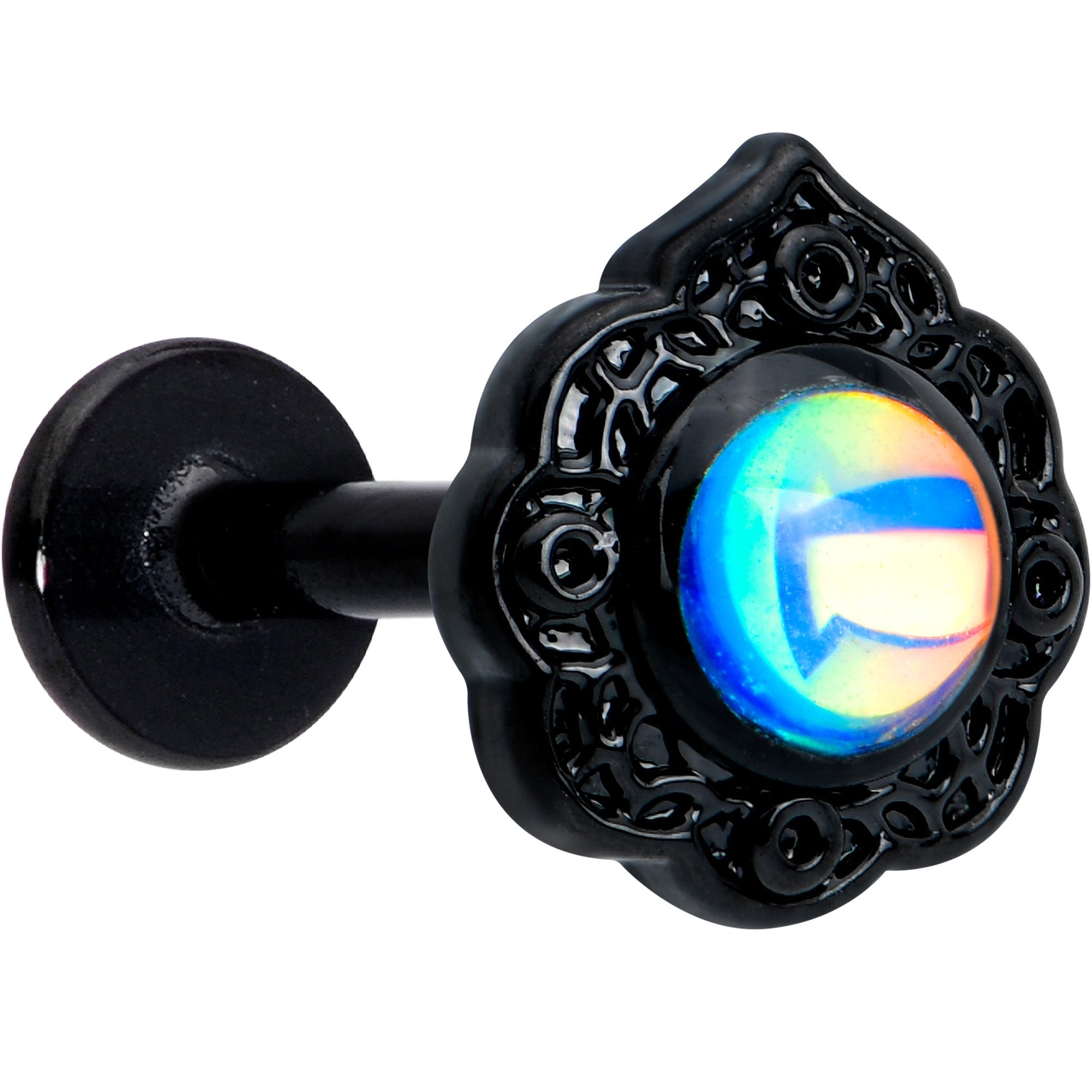 This 16 gauge lip ring full of fairy tale elegance. It's made with an 8mm black PVD over 316L surgical grade stainless steel straight post with a flat disc end. It features a scalloped, oval charm. The charm is set at the center with a white tourmaline that shifts to blue for a look that is truly magical. It's further embellished with a filigree detailing and you can wear it in multiple piercings including lip, monroe, tragus, helix, and some conch piercings. You can't help but feel the magic when you're wearing this fairy tale-worthy cartilage jewelry!Specifications