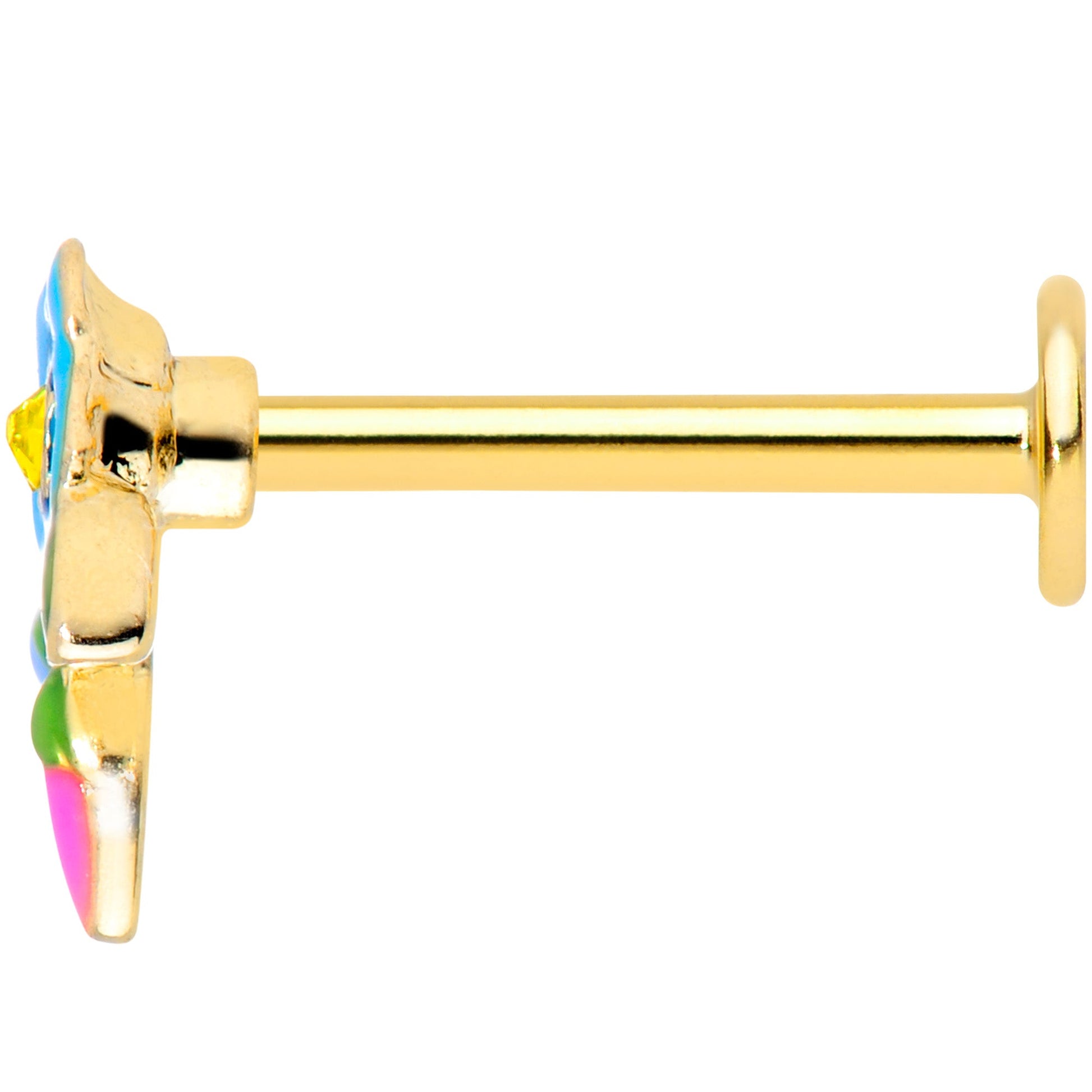 Brighten up your day with the bright colors of this 16 gauge lip ring! It's made with an 8mm gold tone PVD over 316L surgical grade stainless steel straight barbell with a flat disc end and features a flower charm with bright aqua petals and a yellow gem set at its center. This flower cartilage earring can add color to multiple piercings including lip, monroe, tragus, helix, and some conch piercings. Grab your garden shears and pick a pair of neon posies with the concentrated colors of this floral cartilage jewelry!Specifications