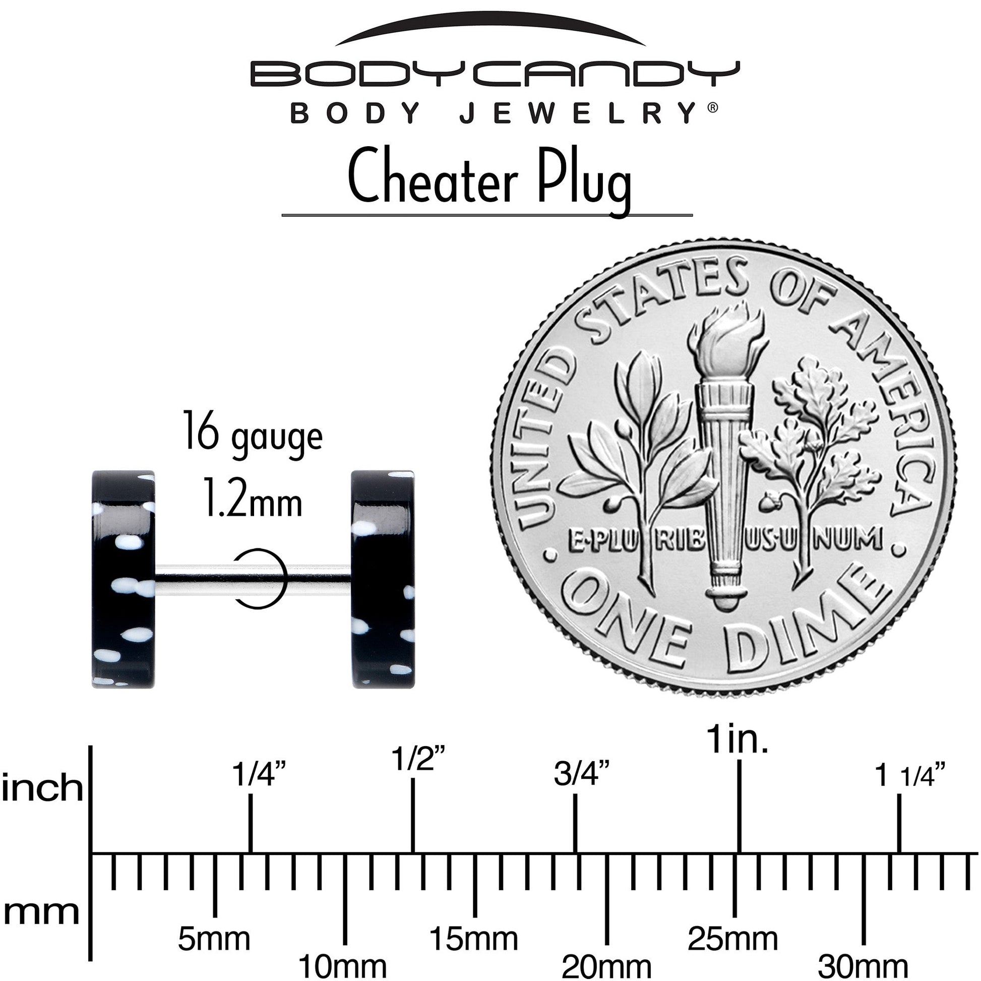 Get the look without the commitment with these trompe l'oeil cheater plugs! They're made with 16 gauge stainless steel posts to fit standard or slightly larger sized pierced ear lobes. The front and back feature 0 gauge round segments to give the look of plugs with no stretching required. The front and back portions are black and feature a white polka dot pattern that it totally pin-up perfect. Get the look without committing to stretched lobes with these uncomplicated cheater plugs. Sold as a set of two.Specifications