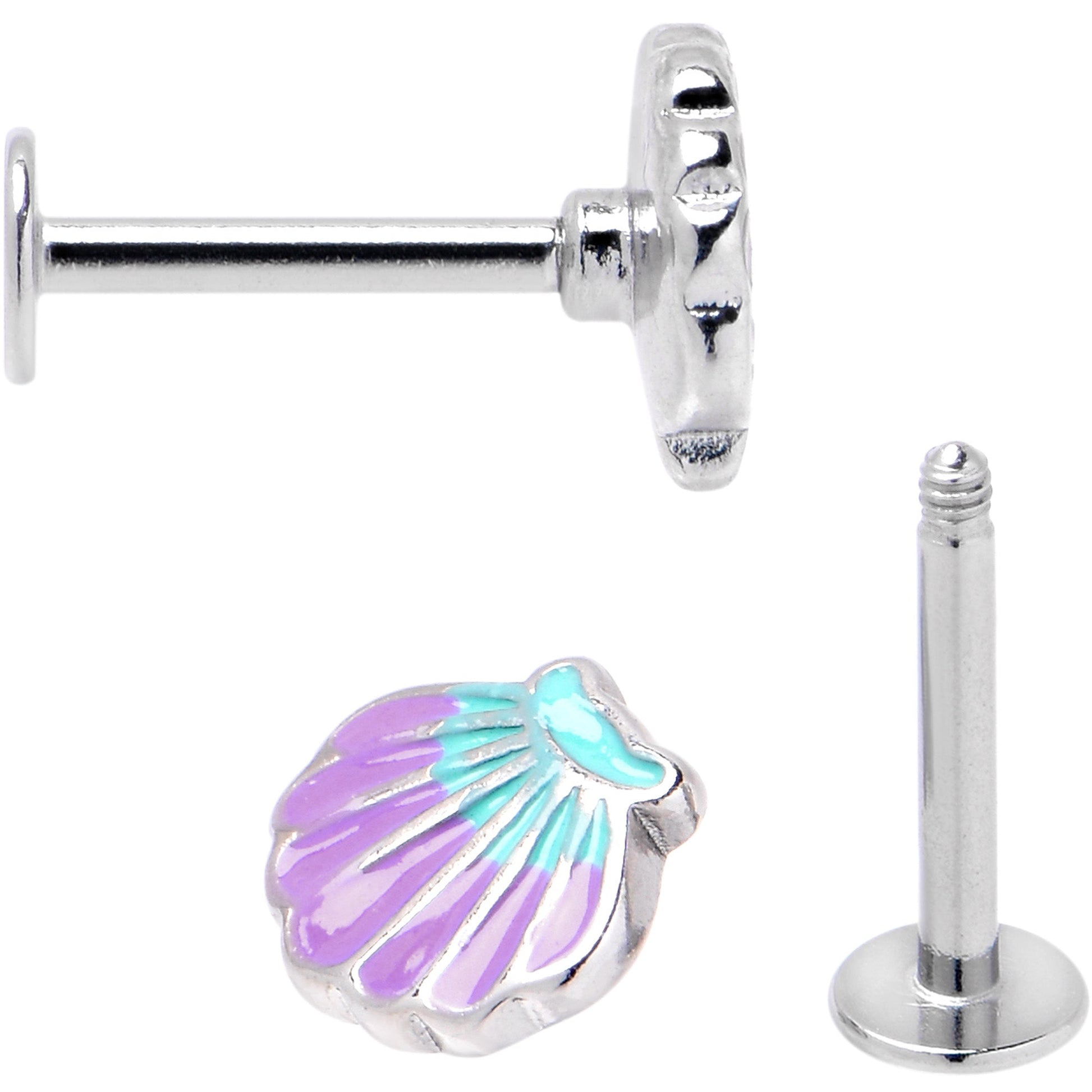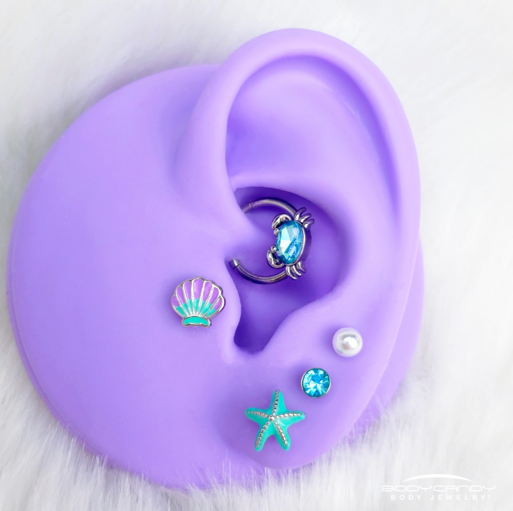 Get ready to ride a wave of style with this multi-piece set of 16 gauge cartilage jewelry. You get a 10mm duable 316L surgical grade stainless steel hinged circular ring that features a blue gem crab charm. It also features a non-removable, hinged segment that makes insertion and removal a breeze. You also get two 8mm durable 316L surgical grade stainless steel straight posts with flat disc ends. One labret features a blue and purple seashell while the other features a blue starfish charm. Also included is a 6mm durable 316L surgical grade stainless steel straight barbell with 4mm ball ends, with one ball end being made with pearlescent white acrylic. You even get a 20 gauge stud earring with a blue gem end and a friction back for secure wear. You can rock this jewelry in multiple piercings including lip, tragus, helix, conch, daith, and lobe. Sail the seas of style for summer with this set of cartilage rings for a perfectly curated ear. Sold as a set of five.Specifications