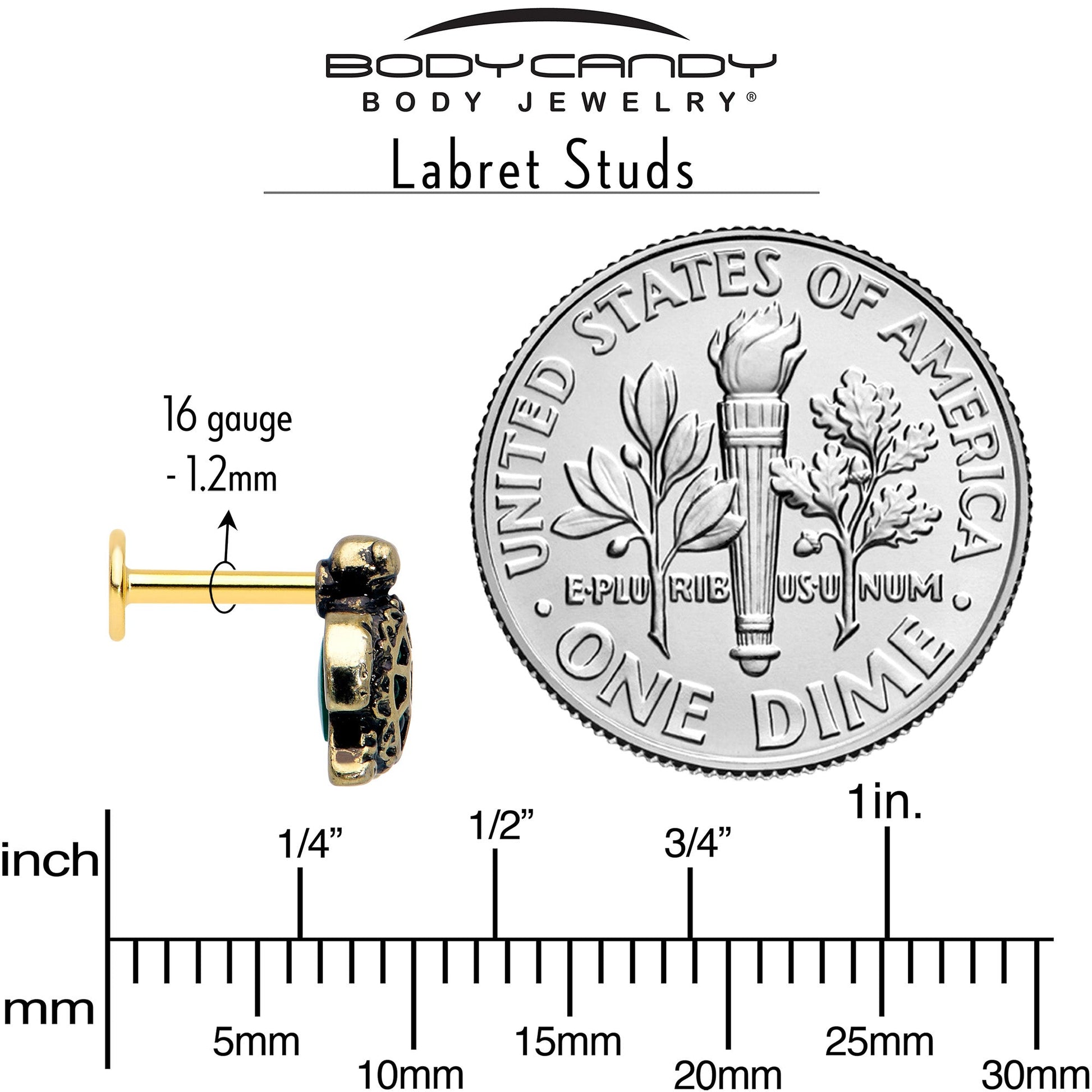 Show your love for your favorite ocean creature with the tribal influenced sea turtle in this set of 16 gauge lip rings. They're made with 8mm gold tone anodized over 316L surgical grade stainless steel straight posts with flat disc ends. One features a simple ball end while the second features a cone shaped end for a punk rock look. The third features a heavily embellished swimming turtle with green inlay embellishment on the shell. They're internally threaded for maximum comfort on insertion and removal and you can rock them in multiple piercings including lip, monroe, tragus, helix, and some conch piercings. Don't let this stylish sea turtle cartilage piercing jewelry swim away. Sold as a set of three.Specifications
