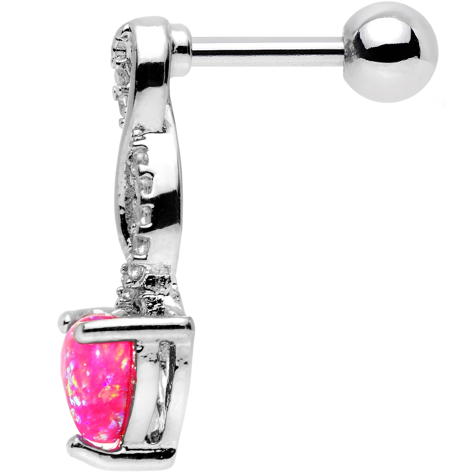 The twist of this left ear 16 gauge tragus accessory catches the eye with its selection of tiny clear gems that lead to the focal point of the pink synthetic opal heart captured at the bottom. The 1/4" (6mm) barbell of this cartilage earring is made up of 316L surgical grade stainless steel to protect your heart (and your jewelry).