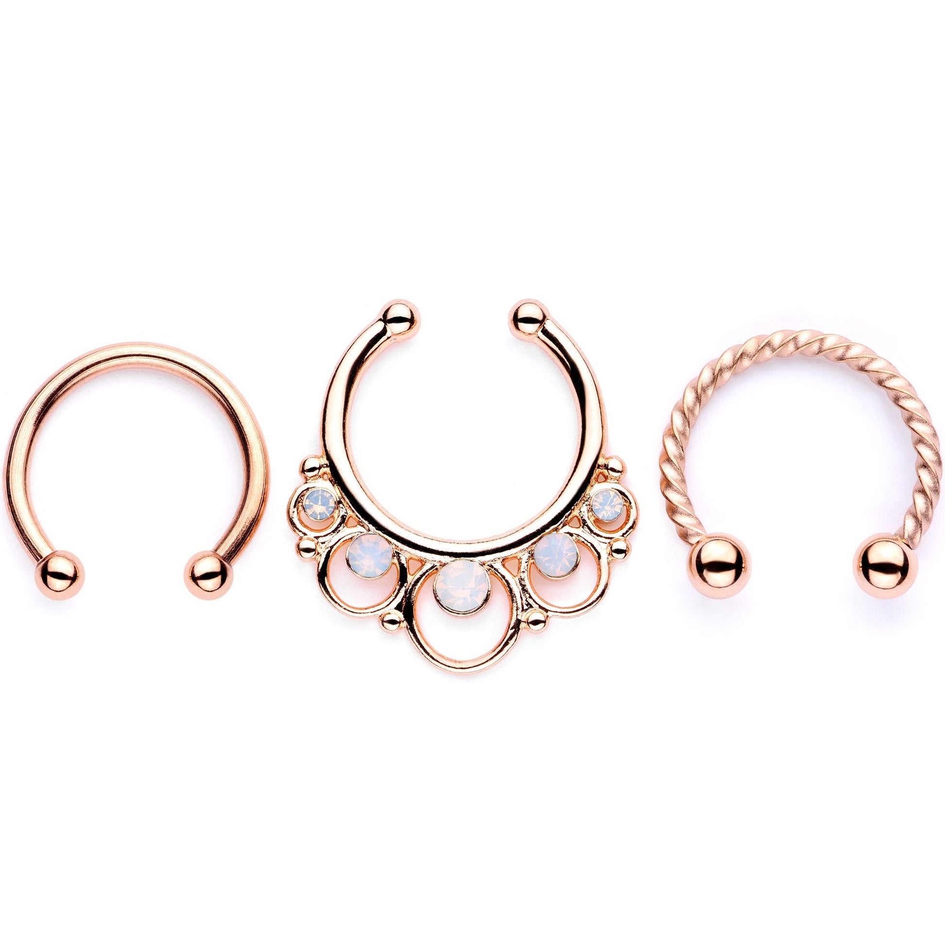 White Faux Opal Rose Gold Tone Twisted Horseshoe Clip On Septum Set