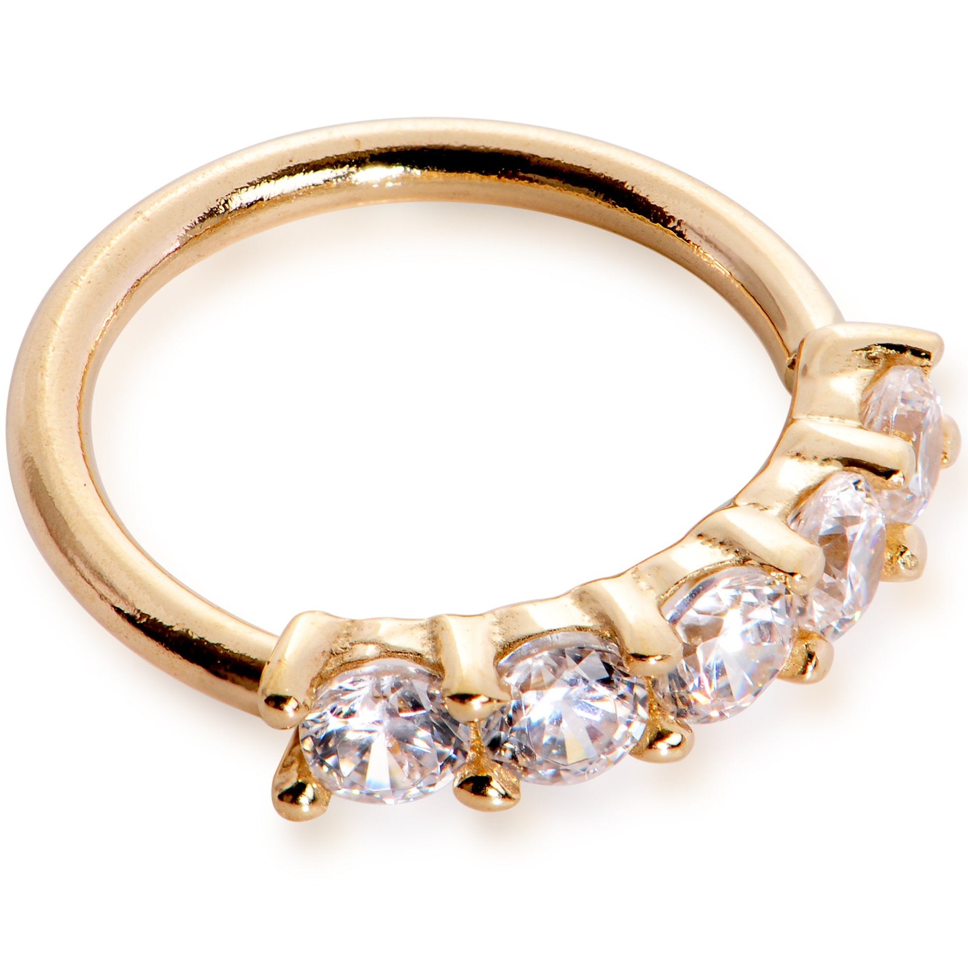 You'll feel like the belle of the ball while you're wearing this 18 gauge universal body jewelry encrusted with five clear cubic zirconia gems. The 1/4" circular ring is made with 14k yellow gold, and is bendable for ease of use. To insert ring simply twist then squeeze rounded ends together and you're ready to go. Can be worn in a variety of piercings including your cartilage, daith, tragus, lip, nose, and any other body piercing that is a perfect fit for you!