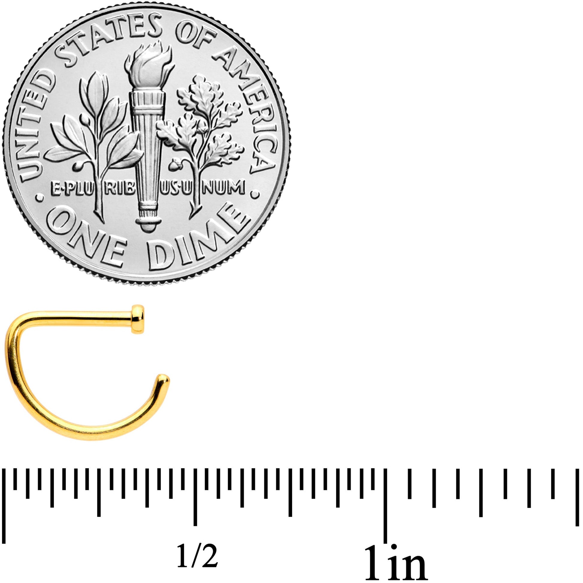 This 18 gauge nostril ring has everything you could possibly ask for! It's made with an 8mm gold tone PVD over solid grade 23 implant grade titanium semicircular ring with a flat disc end. Your nostril piercing is covered with this simple and stylish nose jewelry!Specifications
