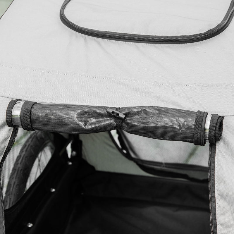 The convertible pet bike trailer and stroller is a great way to maintain an active lifestyle for your pets. This dog trailer for bike can be set up in minutes, making things easy and convenient to transport your furry friends. The mesh zippered screen on the front and back as well as the meshed windows on the sides, allow maximum airflow for your pet. Packed with features that help keep away wind, rain, and road debris from your beloved animals.
