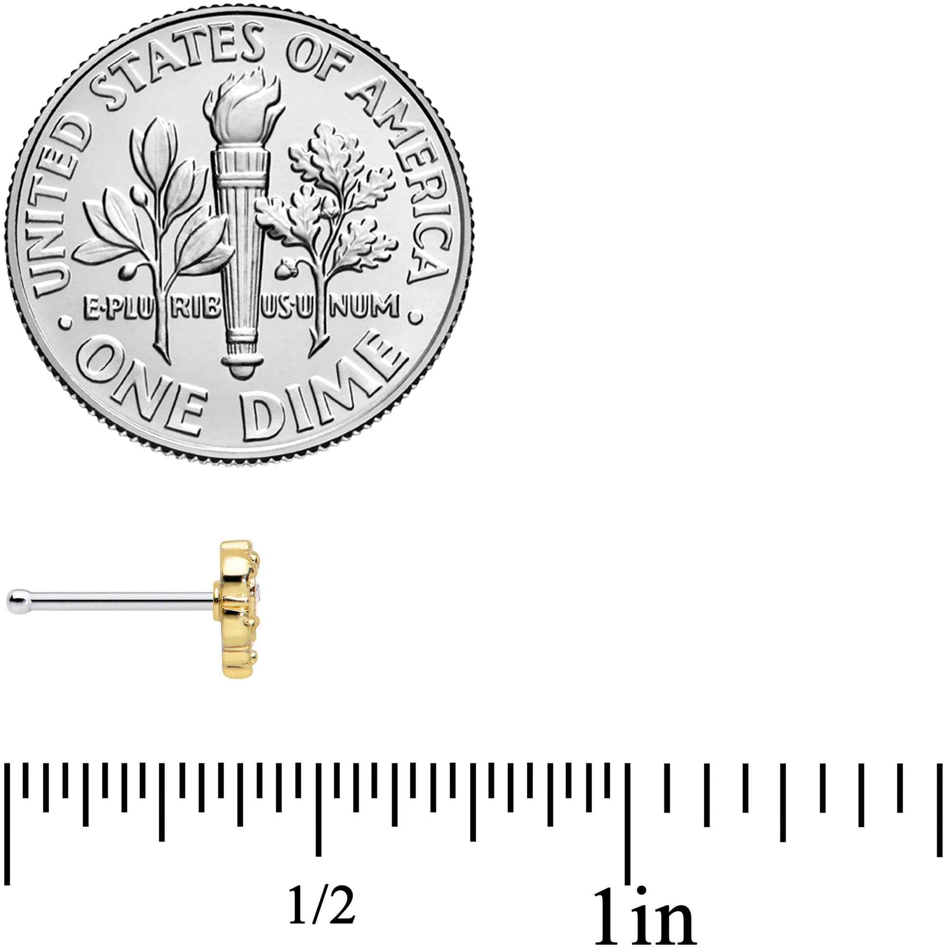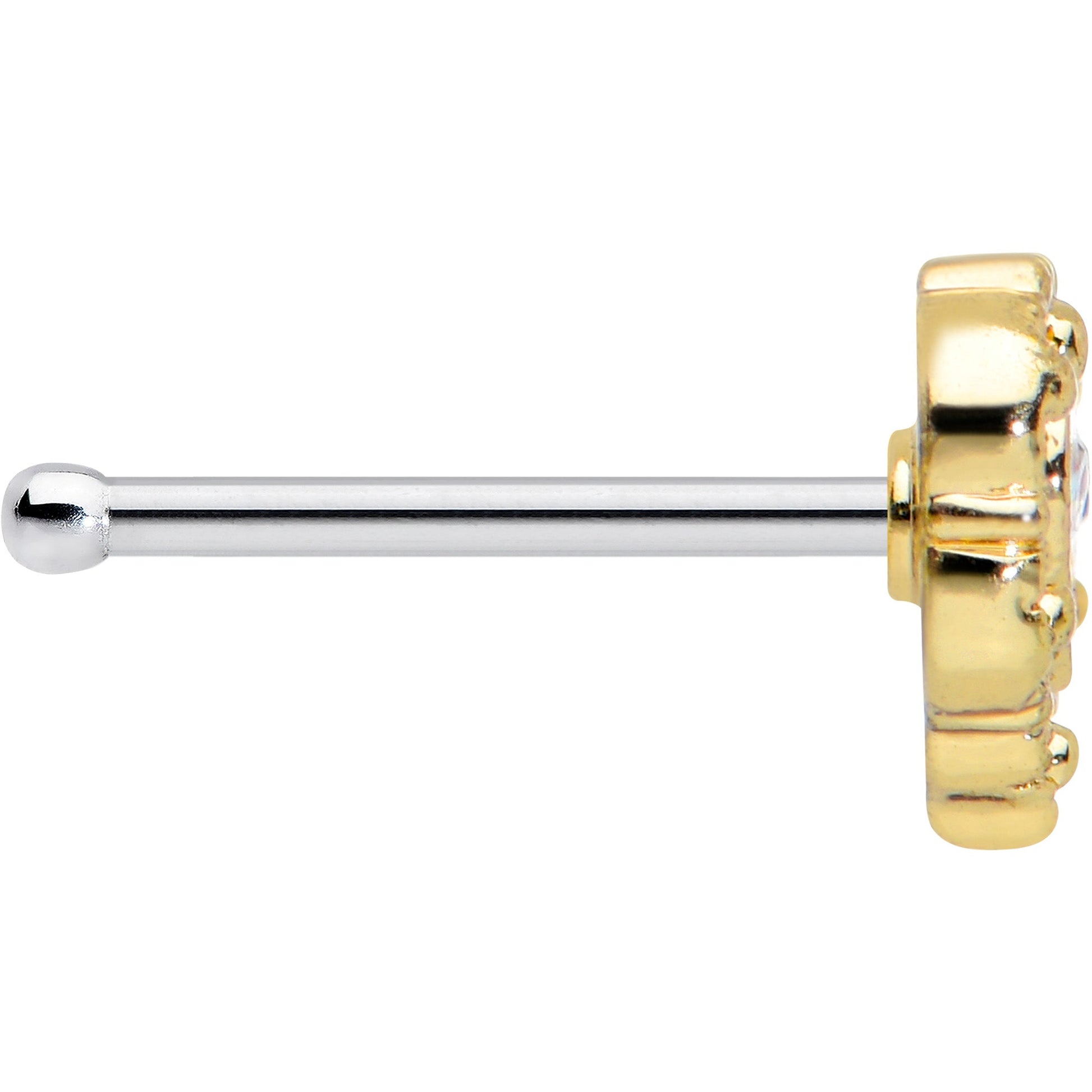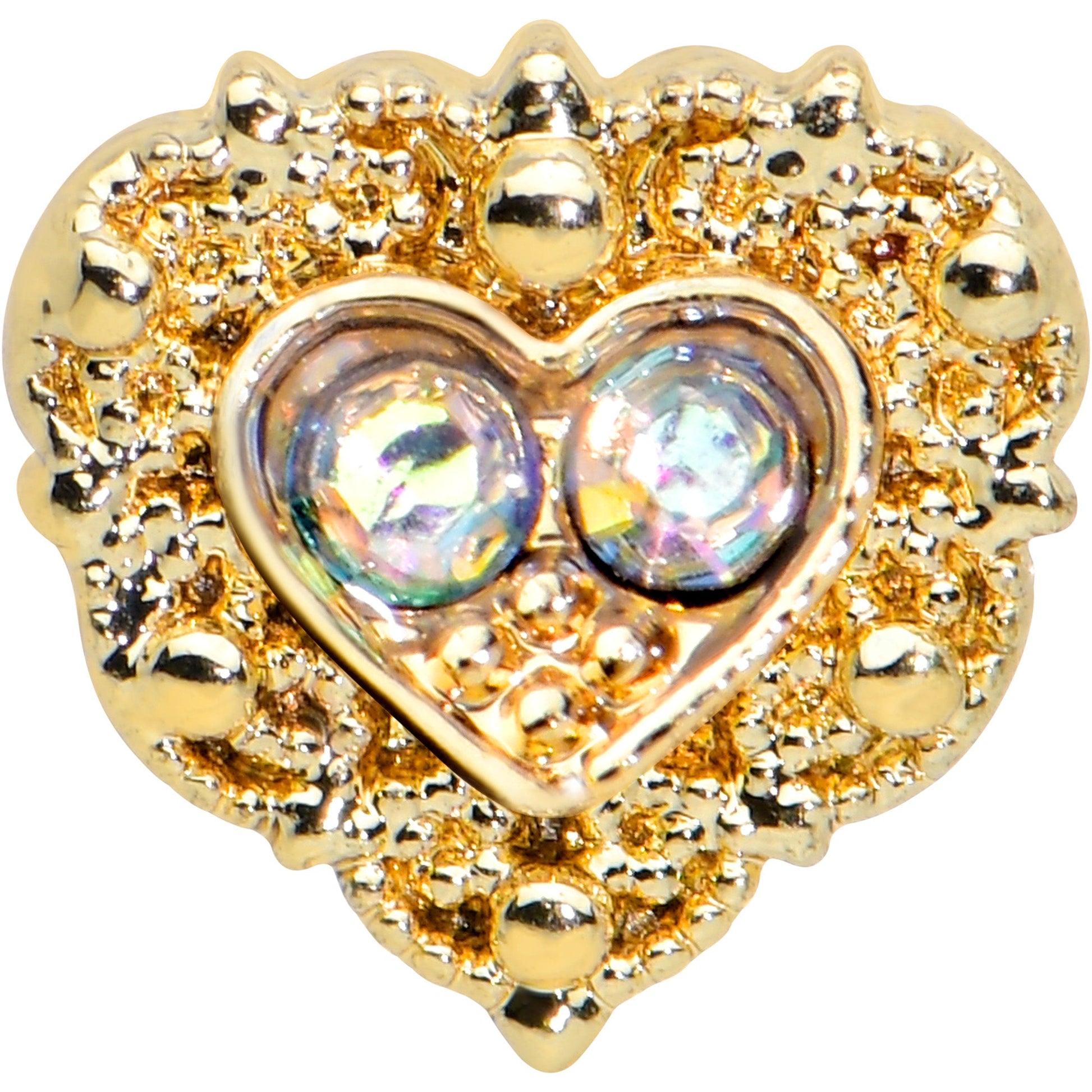 Look luxe without breaking the bank with this 20 gauge nostril ring! It's made with a 6mm durable 316L surgical grade stainless steel straight post. It features a gold tone heart charm, with ornate textured detailing and a pair of aurora gems at the center. You're going to fall in love with the baroque look of this heart-themed nose piercing jewelry!Specifications