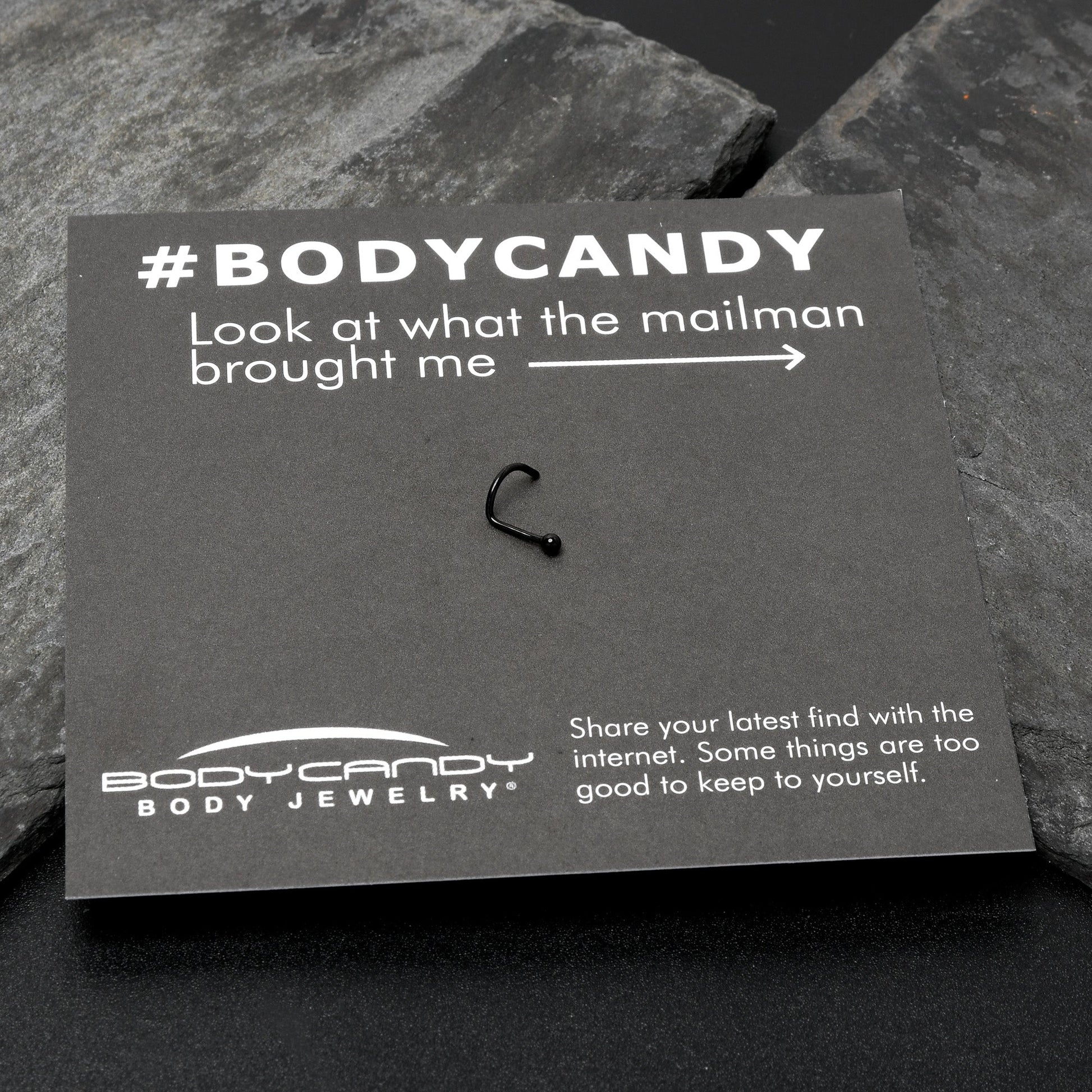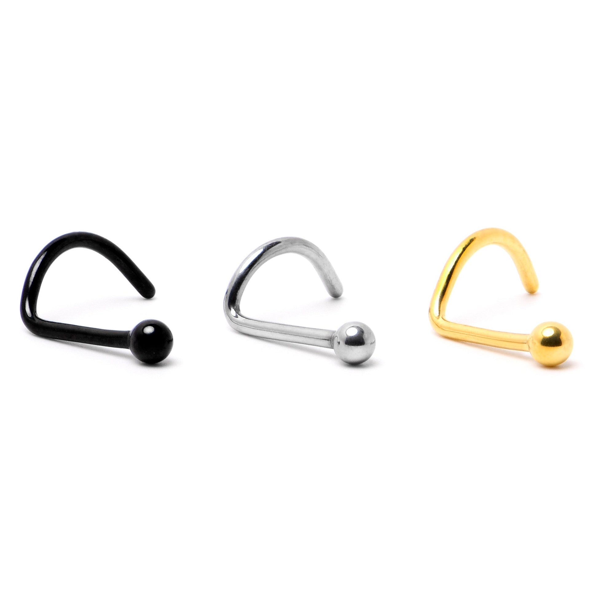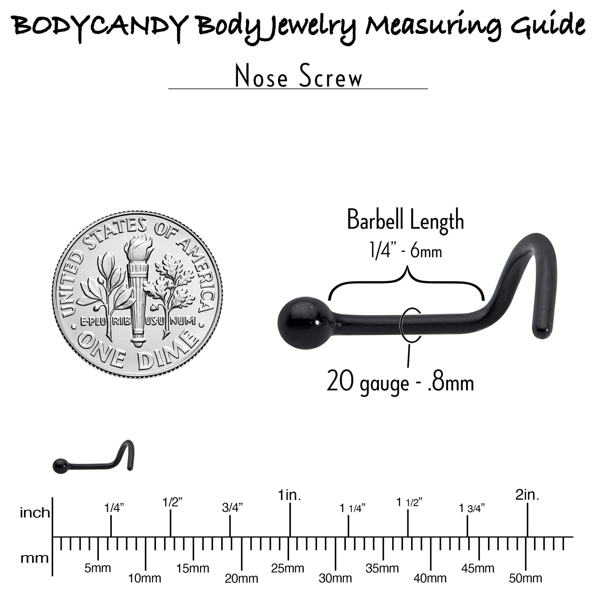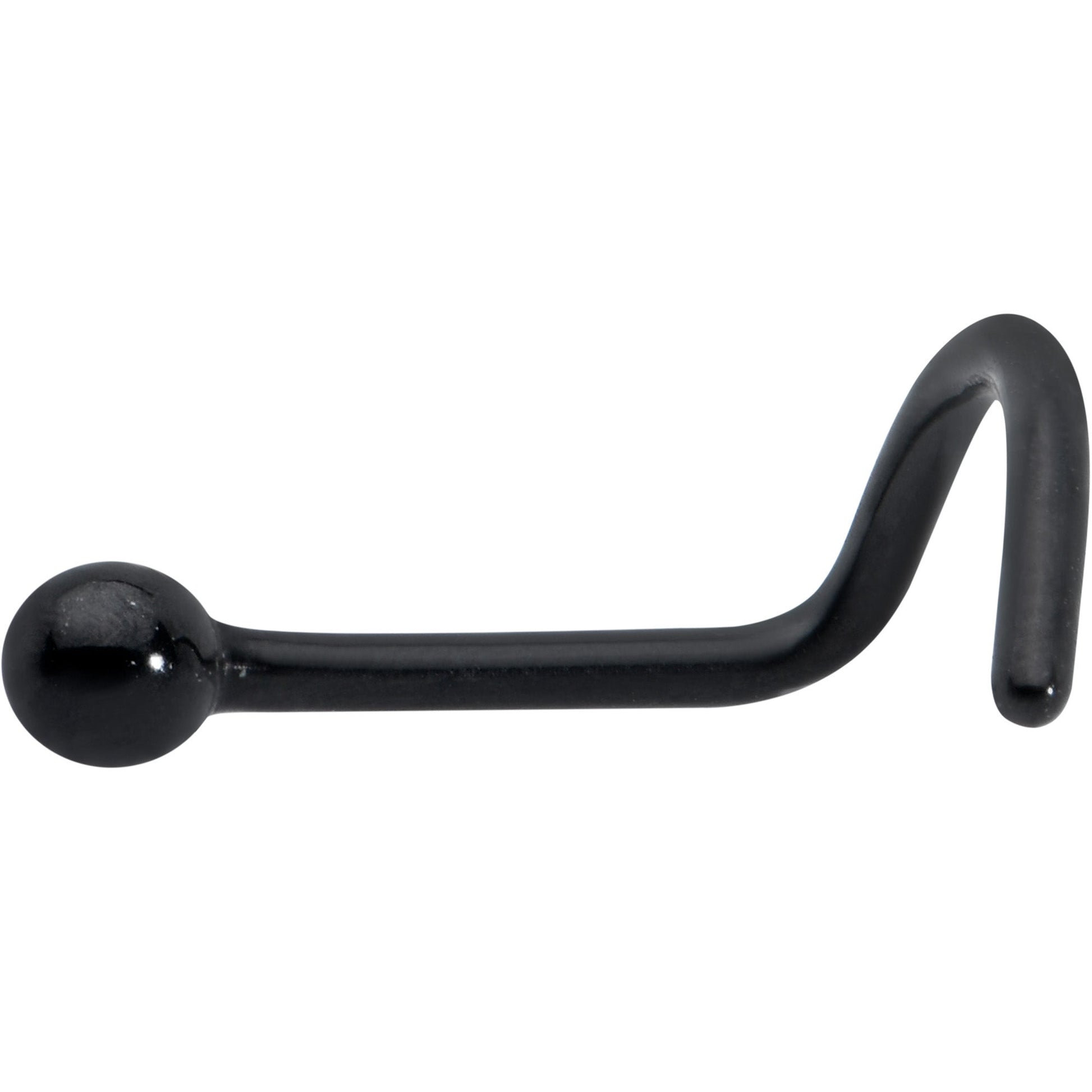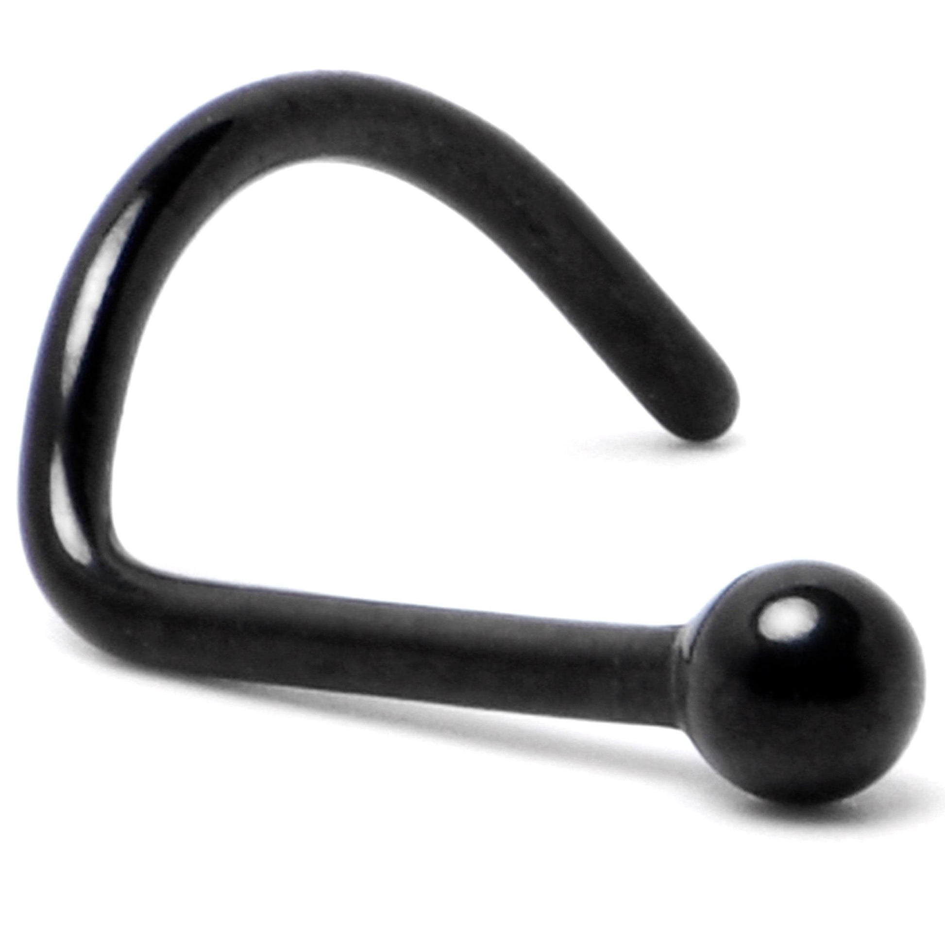 Why go big when you can go stylish and small with this 20 gauge nostril jewelry? It is made with a 6mm black PVD over ASTM F-136 titanium (solid medical grade titanium) post. It features a petite ball end for an understated appearance. It is designed for a left side nostril piercing and also has a curving design that makes for comfortable wear. You will be loving the simple beauty of this diminutive nose piercing ring.Specifications