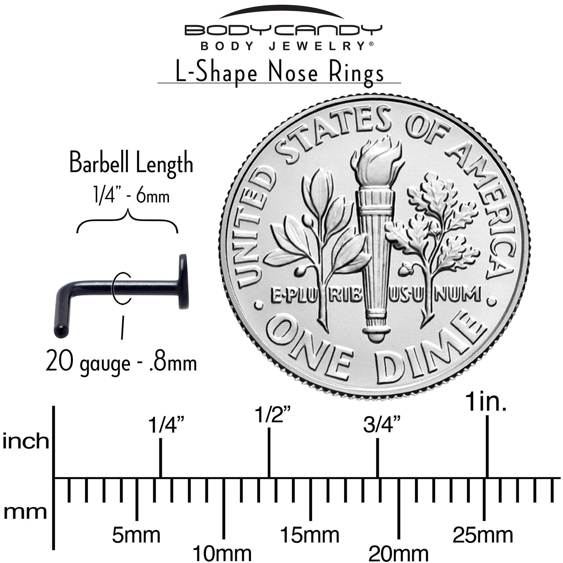 20 Gauge (.8mm), 1/4" (6mm) Length at the Bend, Black PVD over ASTM F-136 Titanium L Shaped Post