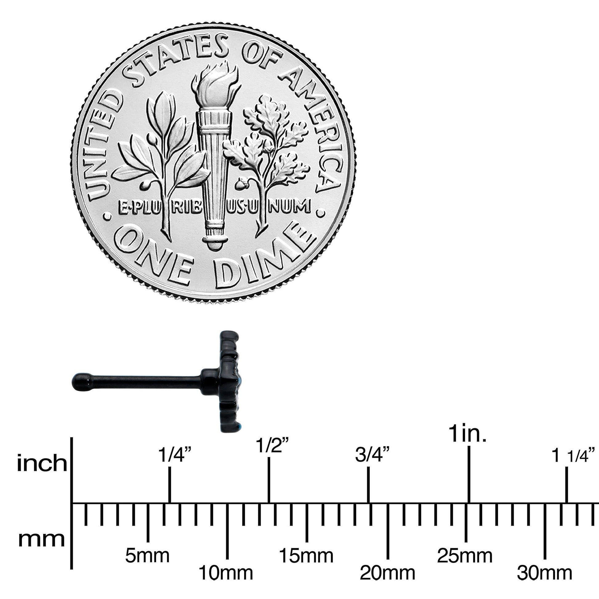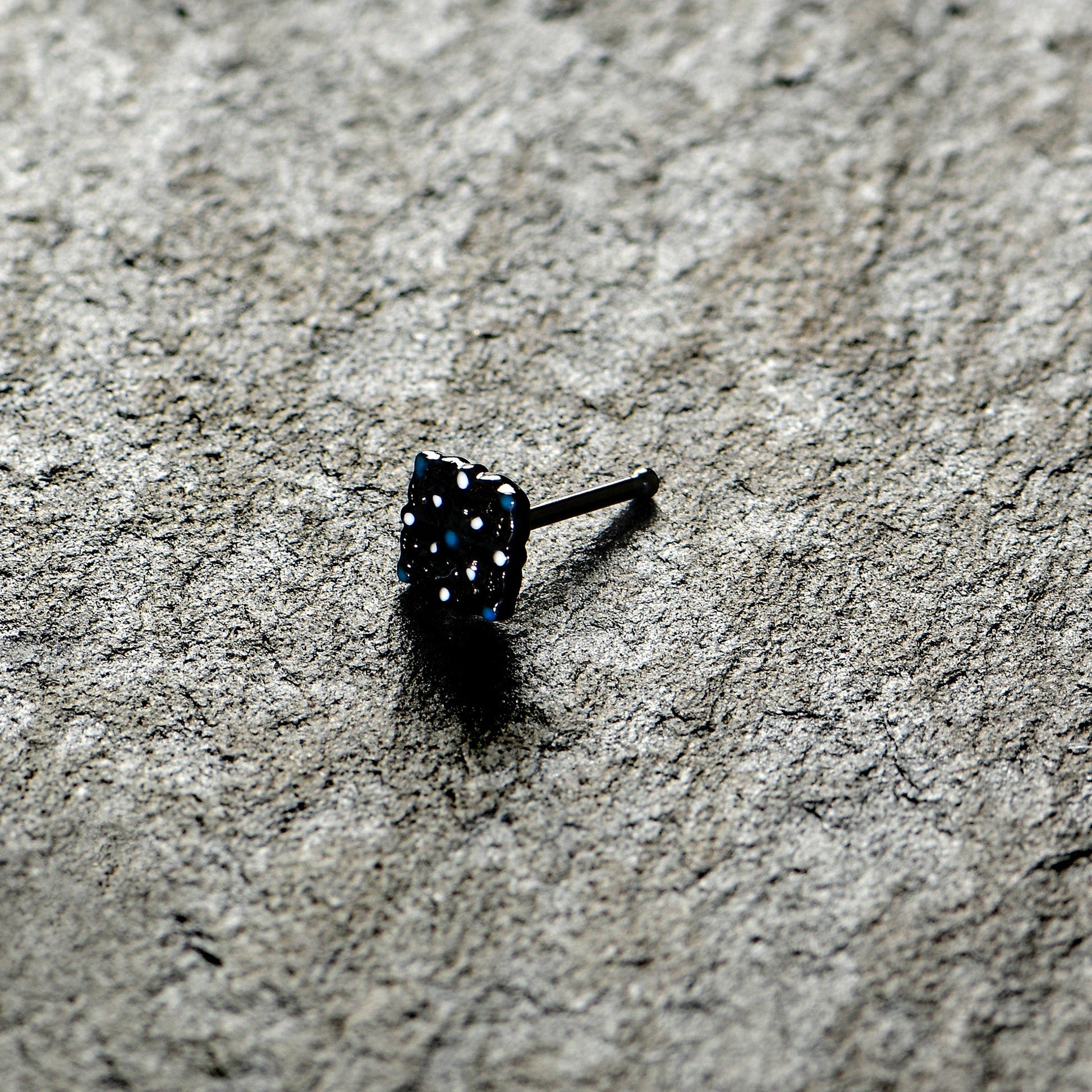 Let this 20 gauge nostril ring get your look all laced up! It's made with a 6mm black PVD over 316L surgical grade stainless steel straight post. It features a lacy styled black charm, set with a blue embellished center. It's further embellished with blue and white along the edges and textured detailing. You're going to love the look of lace when you're rocking this airy, lace-inspired nose piercing jewelry!Specifications