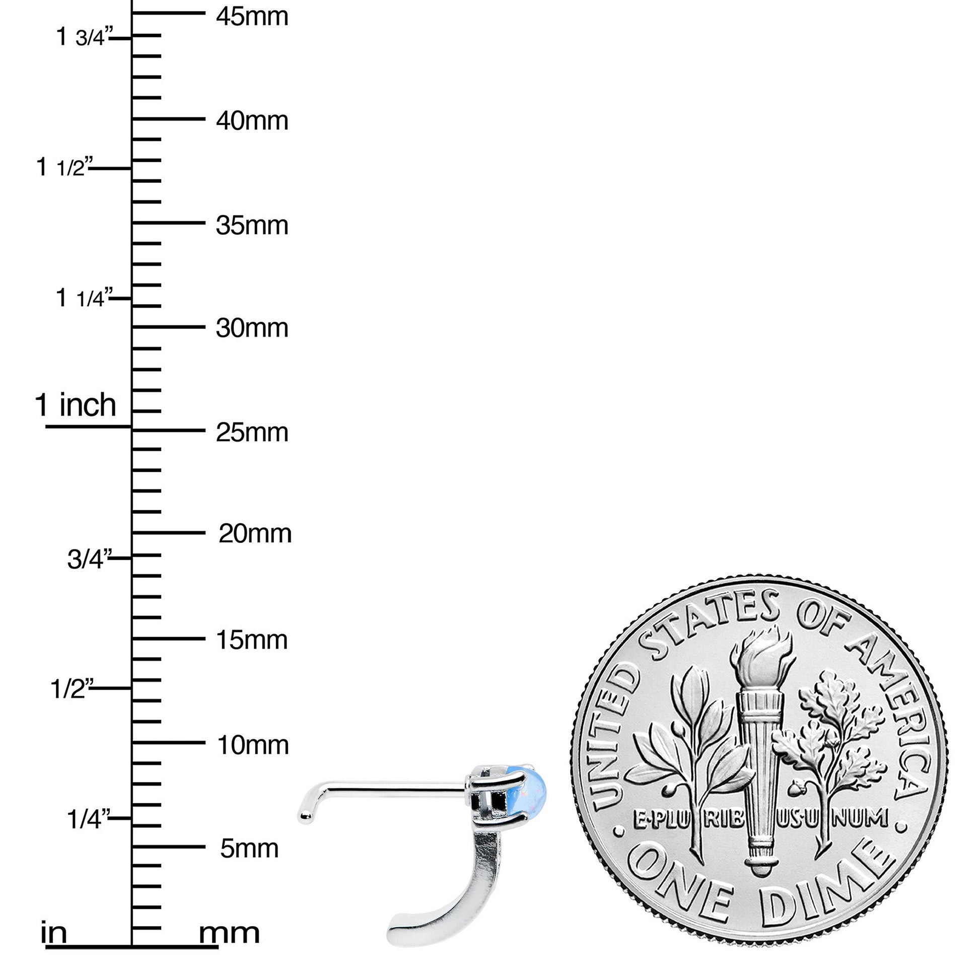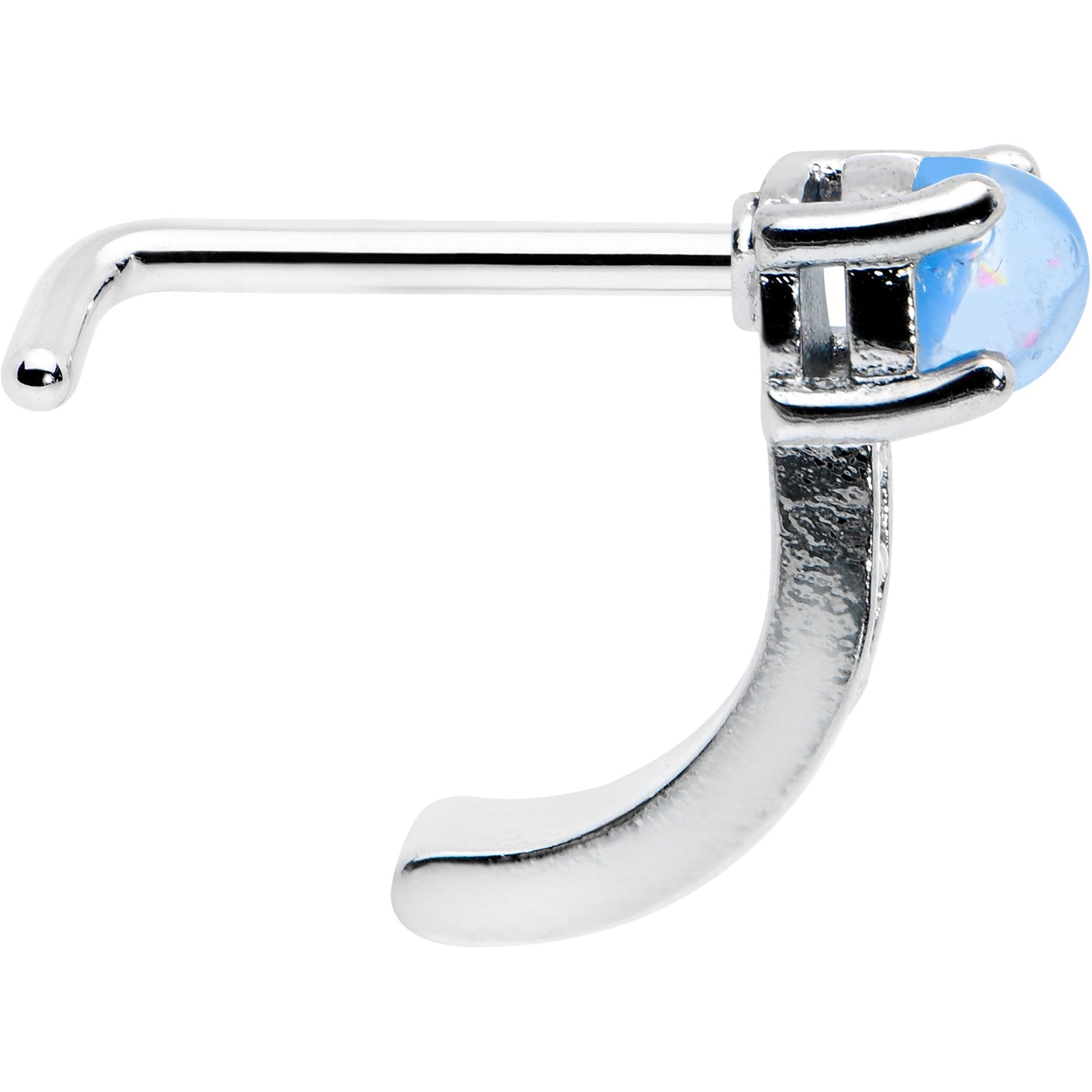 The details may be diminutive but they pack a great big wallop of style on this 20 gauge nose jewelry! It's made with a 6mm length at the bend 316L surgical grade stainless steel L-shaped post and features a curving portion that emulates the look of a hoop while offering the fit of a nose bone. The top features a blue faux opal while the hoop portion features a row of textured embellishment that offer contrast as well as visual impact. They may be petite in size but those textured details pack a potent punch of panache!Specifications