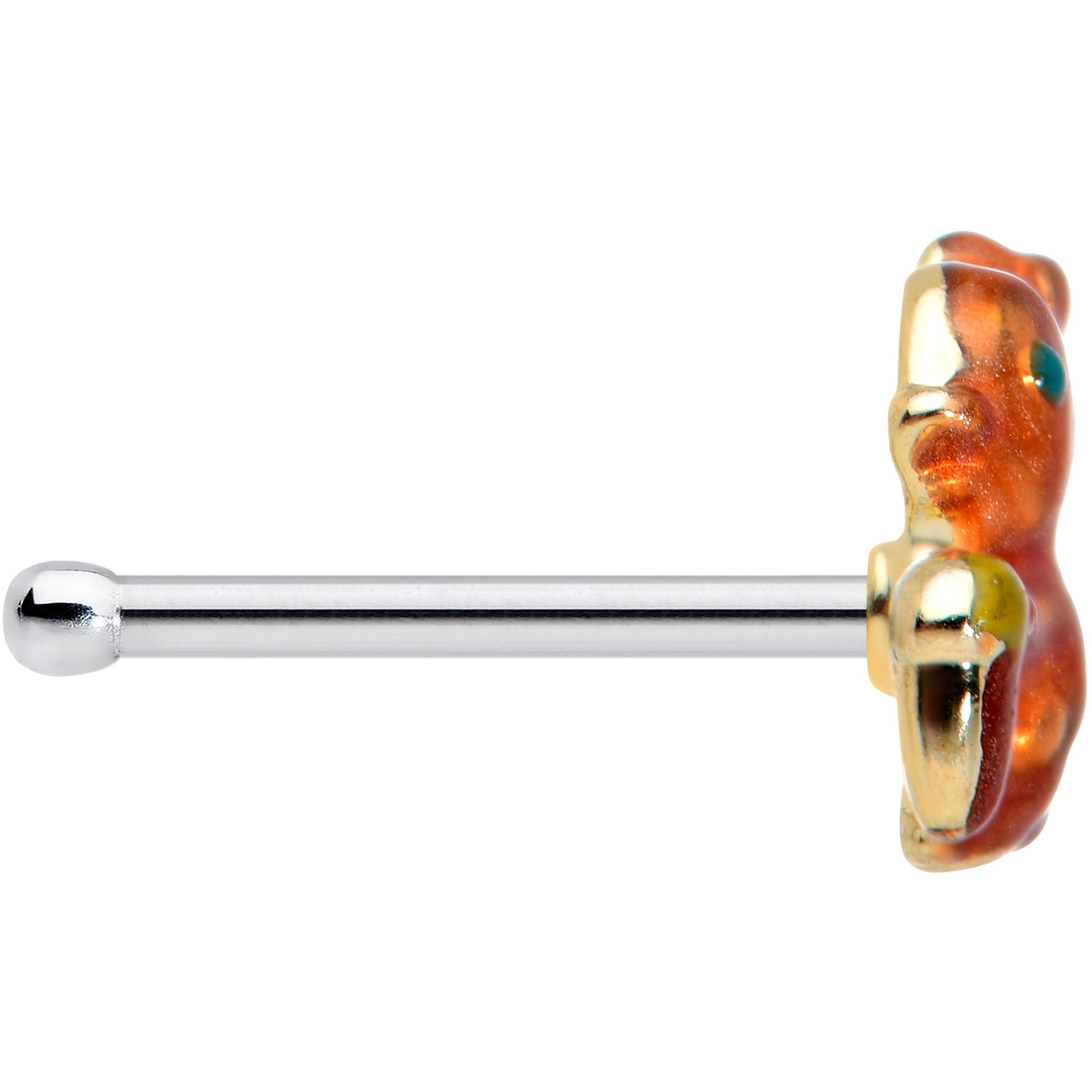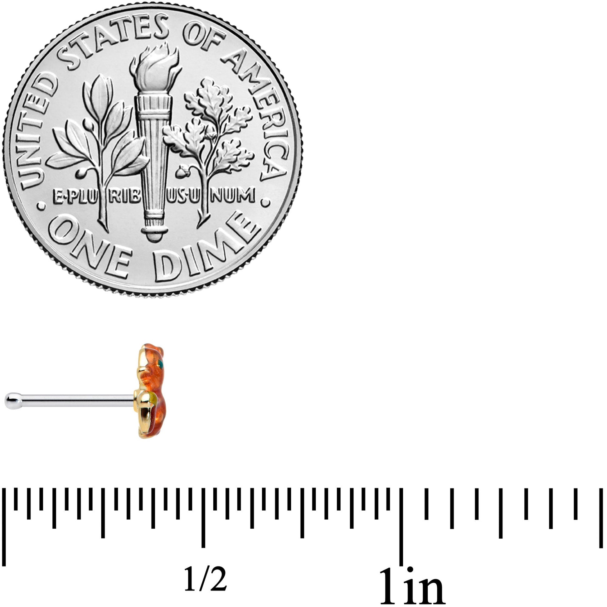 Someone's found a treasure....just like this 20 gauge nostril ring! It's made with a 6mm durable 316L surgical grade stainless steel straight post. It features a cheery squirrel charm, with a light brown squirrel with its tail tipped in yellow. The squirrel is clutching an acorn in dark brown, as if its about to stash it away for the winter. Give your nose piercing a festive look for fall with this charming nostril jewelry!Specifications