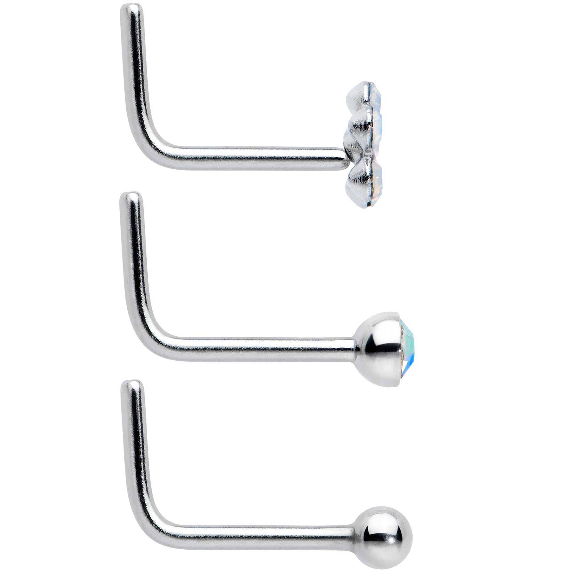 Whether you want simplicity, luxury, or a touch of whimsy, this set of 20 gauge nostril rings has everything you want! They're made with 6mm length at the bend 316L surgical grade stainless steel L-shaped posts. One features a simple disc end, while another features a classic ball end. One features an aurora gem end while another features a clear cubic zirconia gem end. There's one with an openwork flower charm, set with a white faux opal center. The last one features a flower with white faux opal petals and center. You'll have a look for every occasion with this full jewelry wardrobe of nostril piercing rings! Sold as a set of six.Specifications