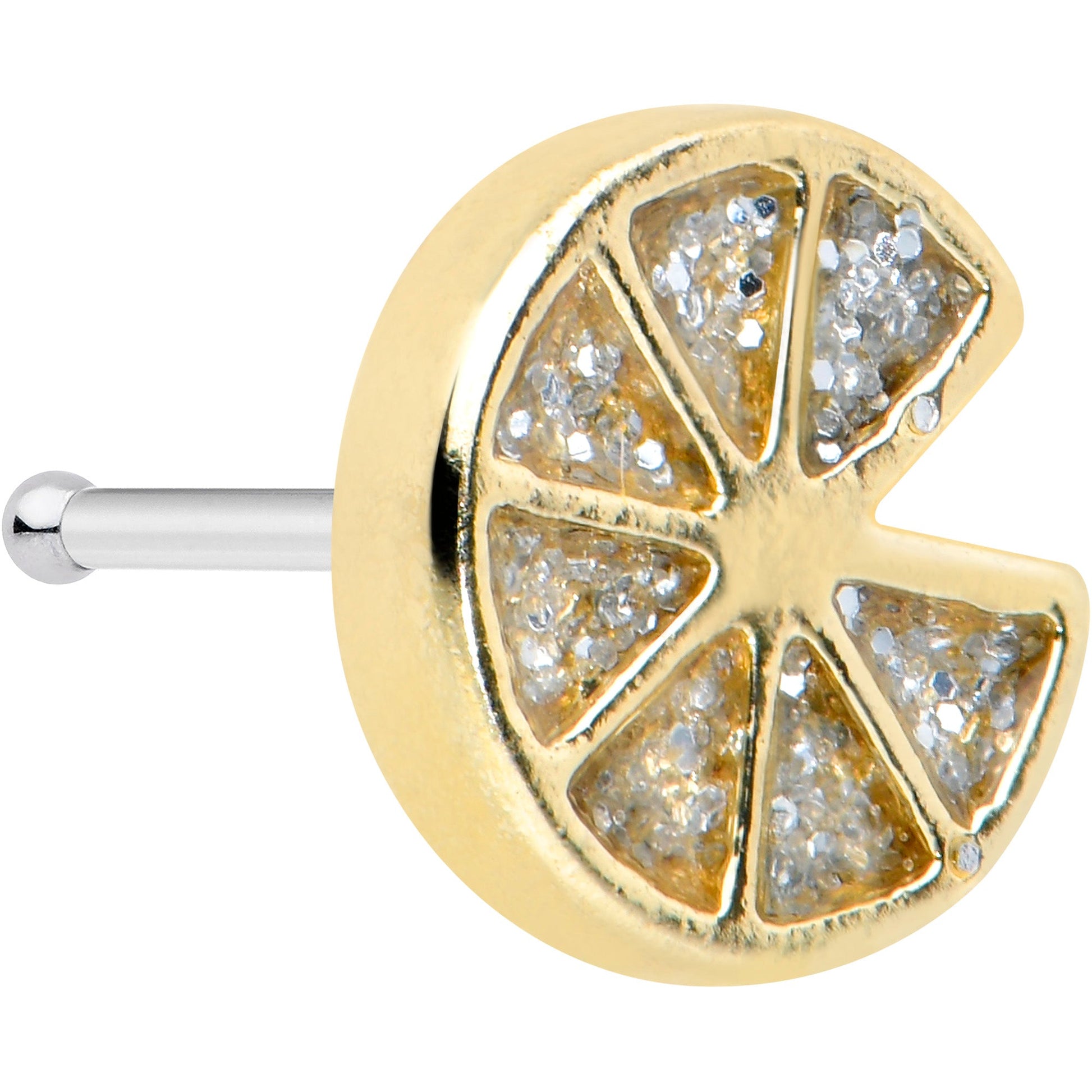 This 20 gauge nose ring is sweet, tasty and looks delicious! It's made with a 6mm durable 316L surgical grade stainless steel straight post. It features an orange slice charm, with clear gem pulp detailing. In fact, it looks so yummy that it appears as if someone has taken a wedge already! If you're ready to get your citrus fruit on this summer, pick the yummy orange slice on this nostril piercing jewelry!Specifications