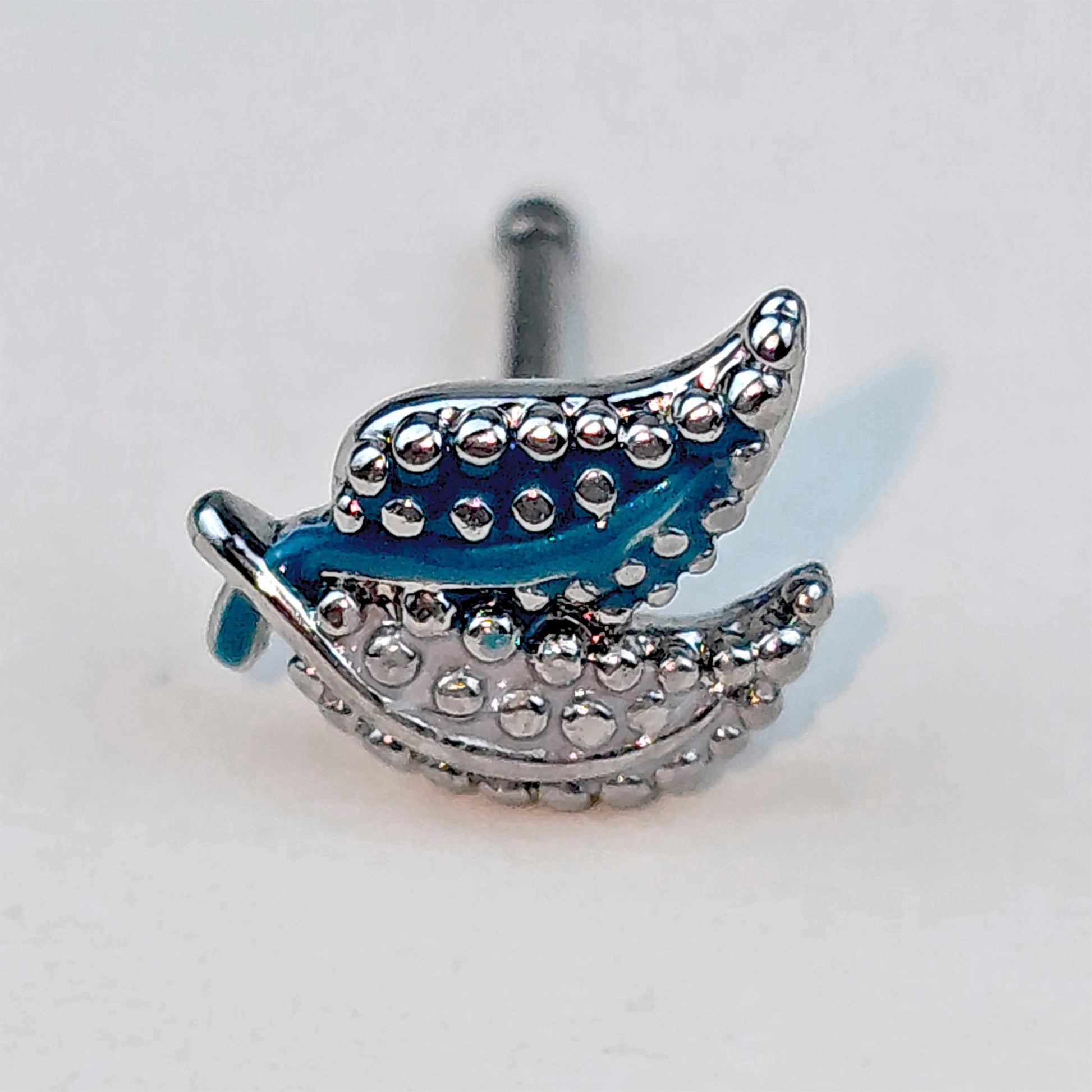 You will never want the leaves to change color when you are rocking this 20 gauge nostril ring. It is made with a 6mm durable 316L surgical grades stainless steel straight post. It features a leaf charm, with a pair of leaves with blue inlay and textured detail for a glamorous look. Love em without leaving em with this luscious, leafy nose piercing jewelry.Specifications
