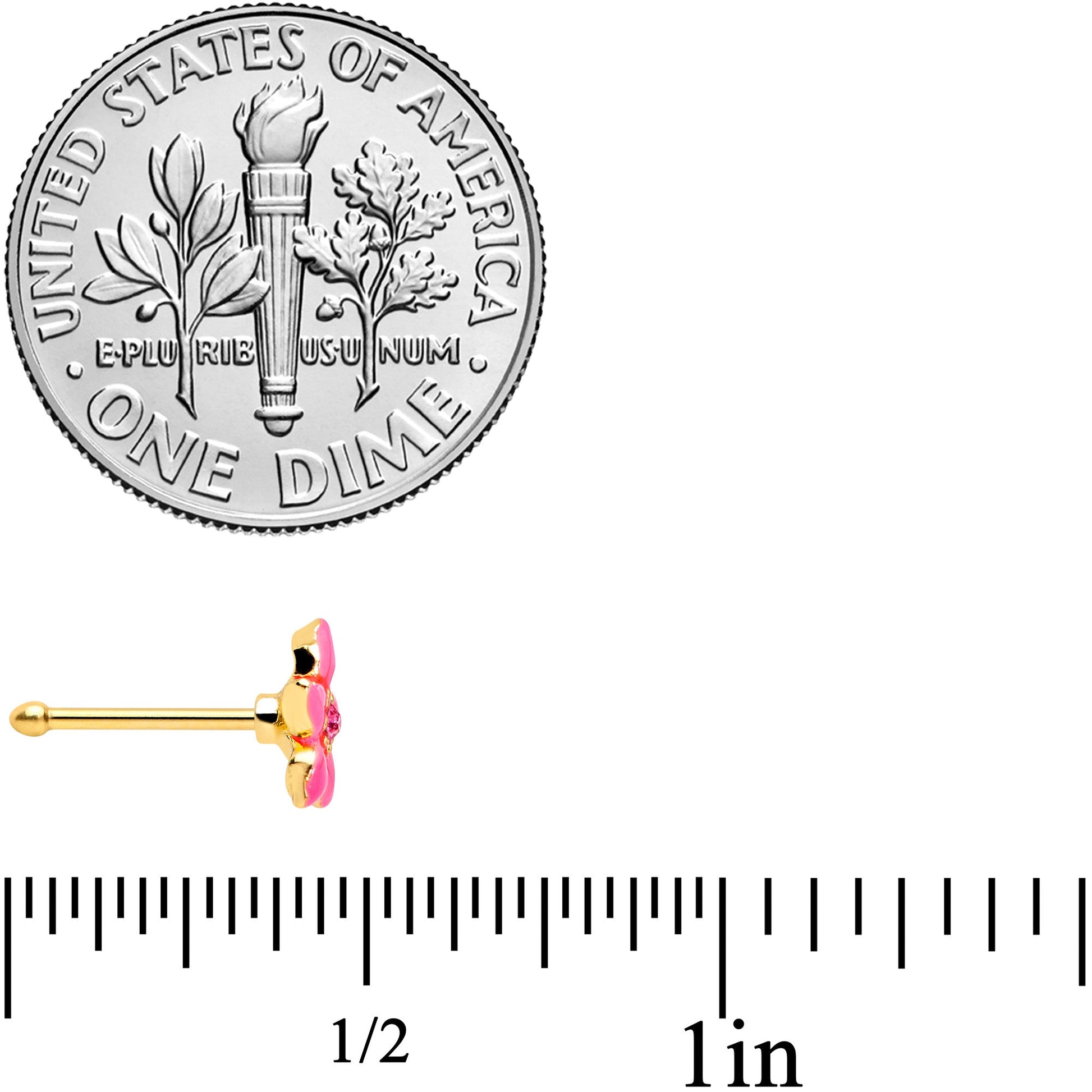 This 20 gauge nostril ring will have you thinking of exotic locales! It's made with a 6mm gold tone PVD over 316L surgical grade stainless steel straight post. The front features a charm of a hot pink, star-shaped flower charm with a deeper pink gem at its center. Give your nostril piercing a look that's hot and exotic no matter where you are with this enticing floral nose ring!Specifications