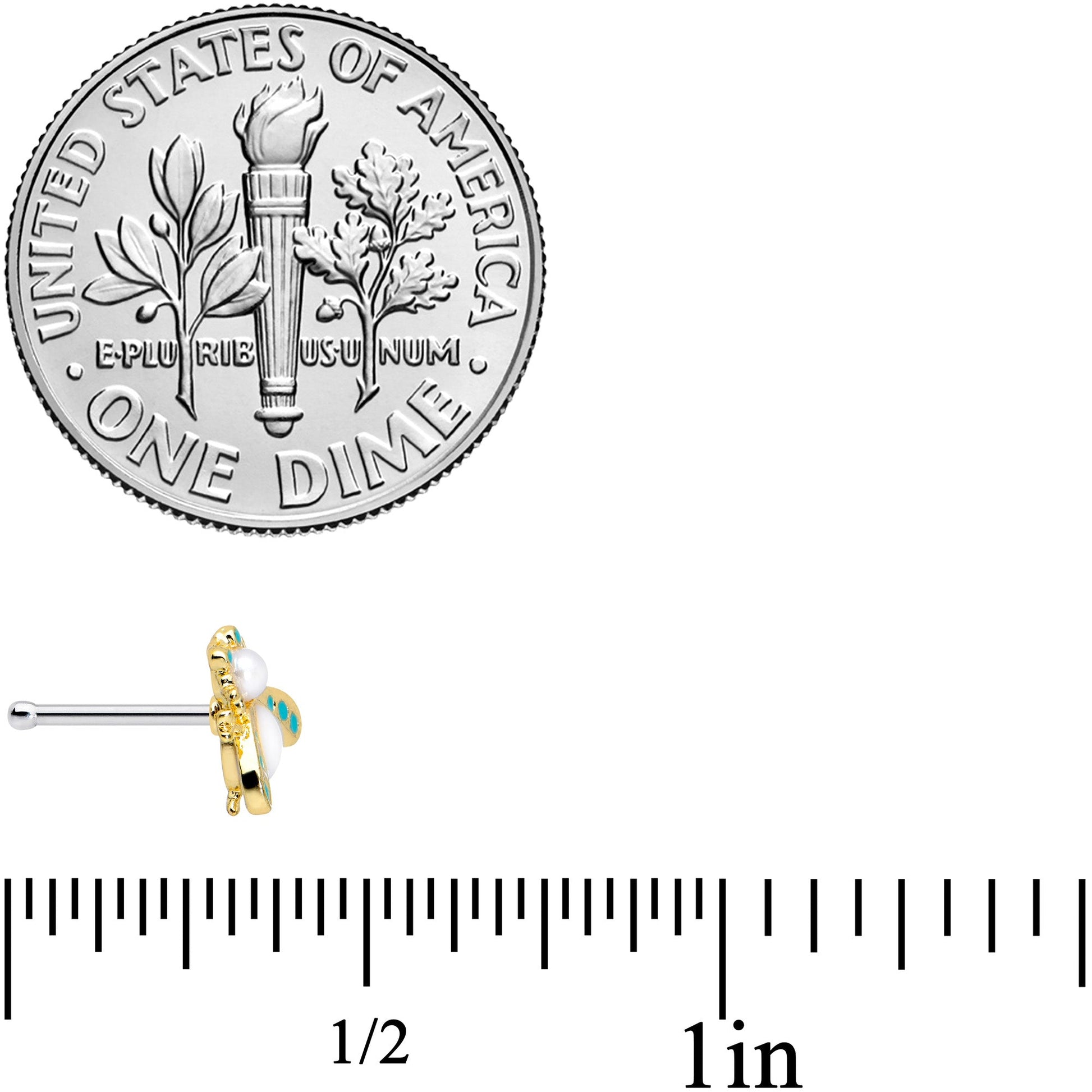 The insect on this 20 gauge nostril ring has tons of wintery style! It's made with a 6mm durable 316L surgical grade stainless steel post and features an insect charm, with white pearlescent orbs for its body and head. The wings are set with green pearlescent orbs for a colorful and cohesive look. Why let winter bug you when you rock this elegant insect nose piercing ring!Specifications