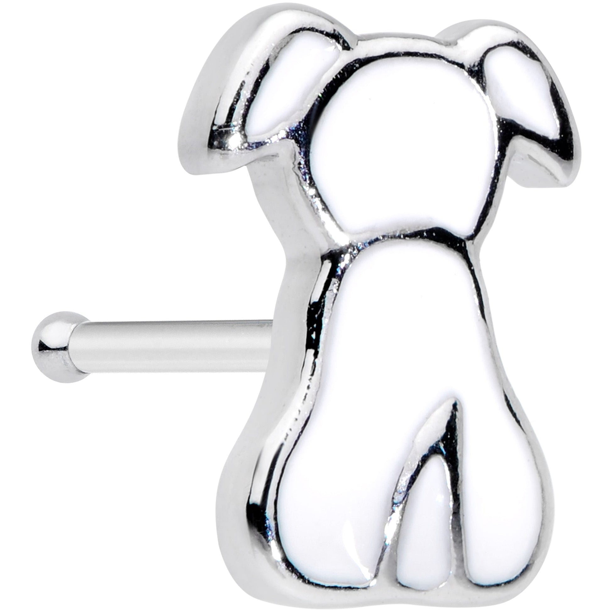 You can tell by perky ears and tail that the dog on this 20 gauge nostril ring is a happy pup! It's made with a 6mm durable 316L surgical grade stainless steel straight post. It features a white dog charm, with the dog seen from the back. It has tail and collar detailing and simple-but-sweet styling. If you prefer pooches or are dazzled by dogs, this friendly canine nose jewelry is sure to make you wag your tail!Specifications