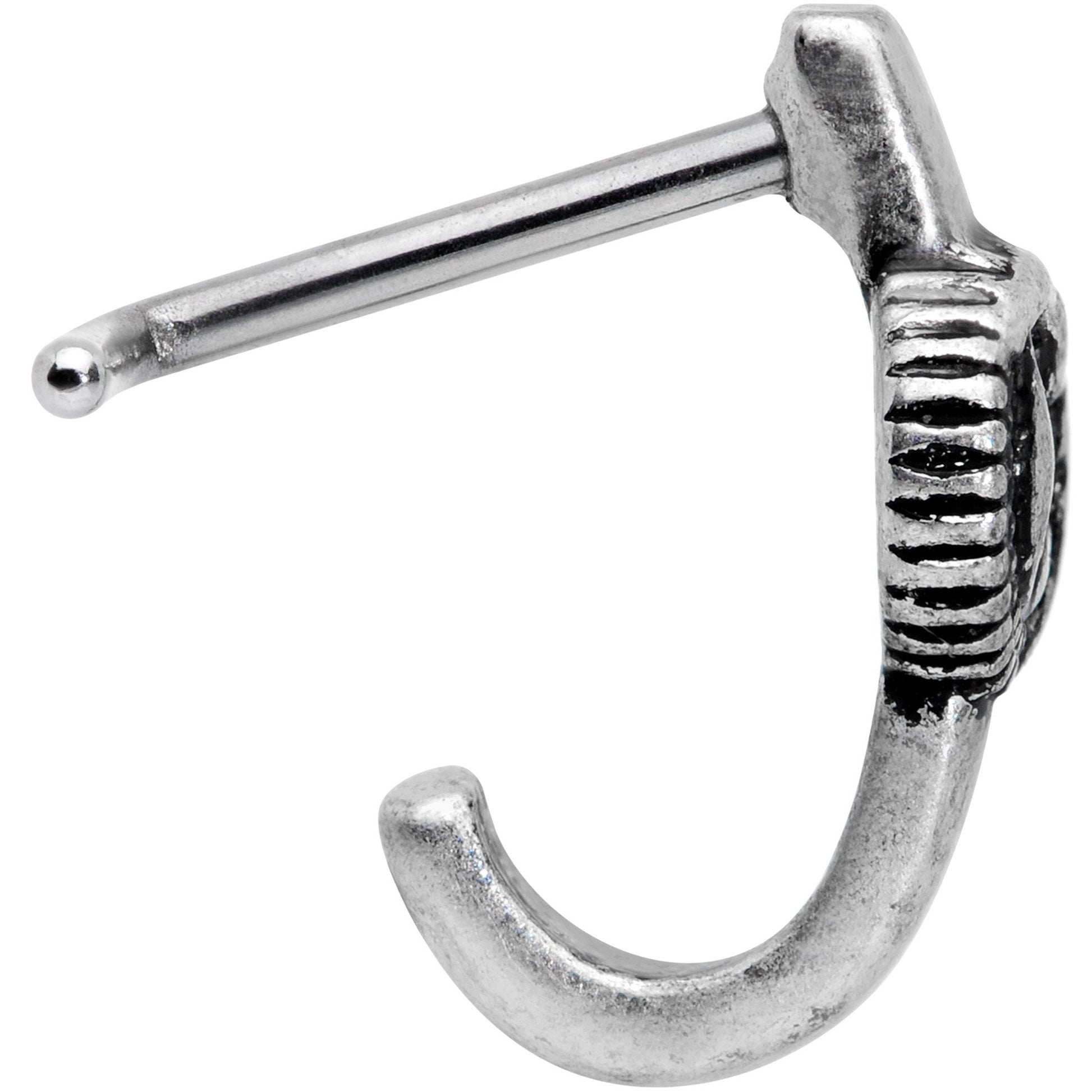 The sun and the moon have come together for a cuddle on this 20 gauge nose ring! The nostril piercing is made with a 3/16" length at the bend durable 316L surgical grade stainless steel post. It features the sun and the moon ends holding one another in a lover's embrace. The unique design gives you the look of a hoop with the ease of insertion of a nose stud. You'll be just as happy as these two are when you have this faux hoop in your nose piercing!Specifications