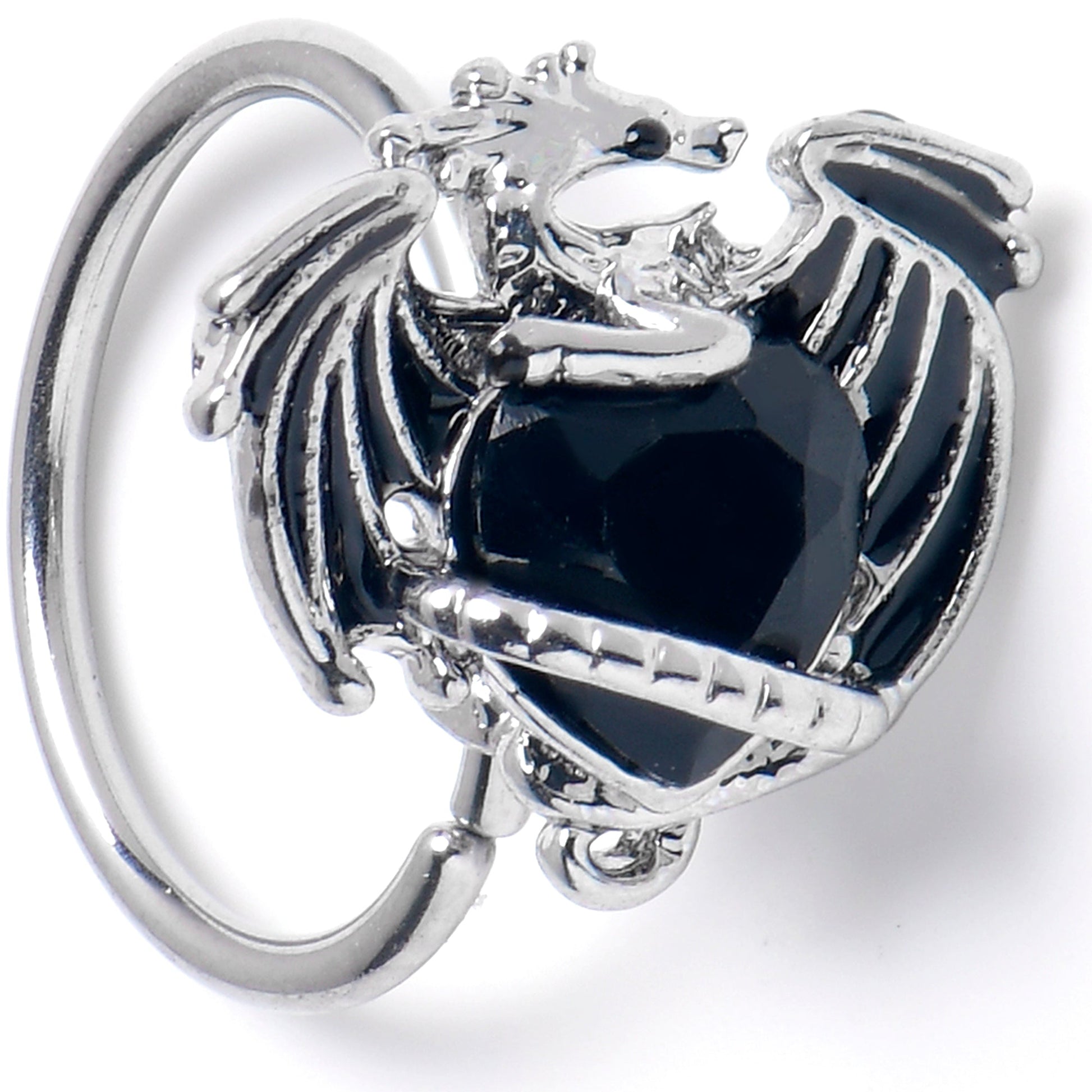 The dragon on this 20 gauge nostril ring has a hoard of love to share. It is made with an 8mm durable 316L surgical grade stainless steel circular ring. It features a dragon charm with embellished wings. The dragon is clutching a black cubic zirconia gem heart for added style. You will definitely want to share this dragons love with this medieval style nose piercing jewelry.Specifications