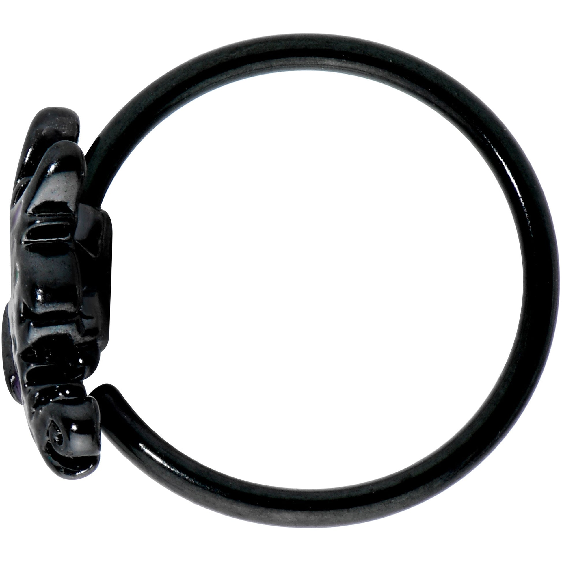Let your nostril piercing float like a butterfly with this 20 gauge nose jewelry! It's made with an 8mm black PVD over 316L surgical grade stainless steel circular ring. It features a butterfly charm, with the butterfly in profile. The butterfly's wings are inlaid in purple and green for a gorgeous color combination that really packs a punch. Add wings to your look with this beautiful butterfly nose piercing jewelry!Specifications
