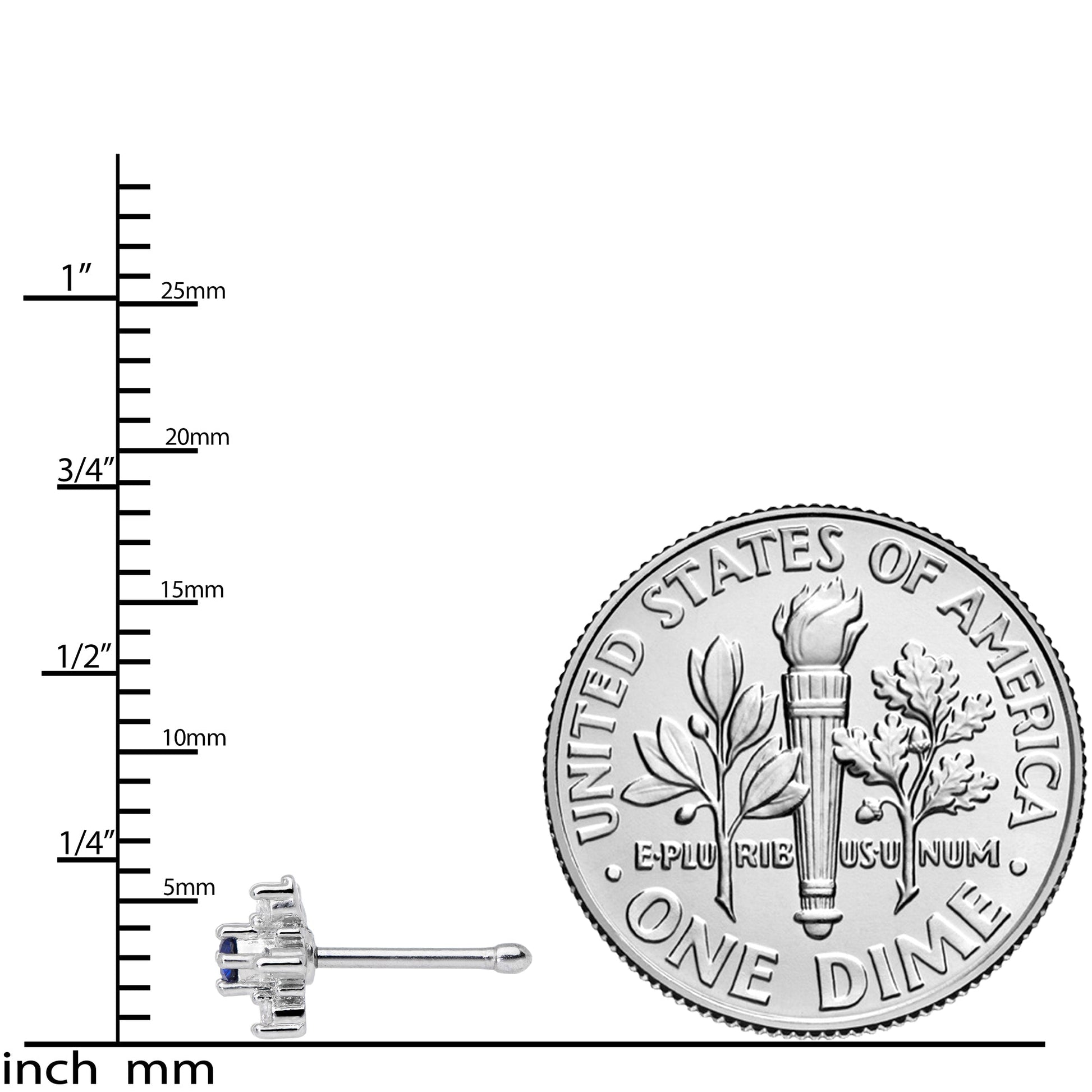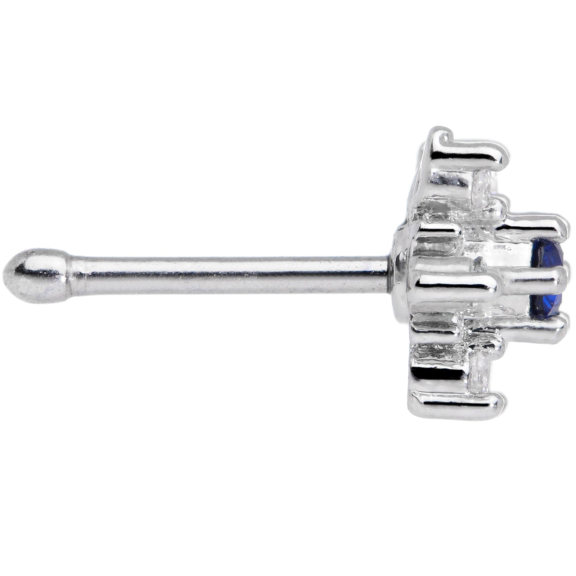 The snowflake on this 20 gauge nostril jewelry is one that you'll never let melt away from you! They're made with an 8mm durable 316L surgical grade stainless steel straight post. The end features an intricate snowflake charm set with clear cubic zirconia gems as well as a deep blue cubic zirconia gem at its center for a luscious touch of color you'll totally fall for! This winter, let the snow spruce up your nose piercing with these sweet and sumptuous nostril ring!Specifications