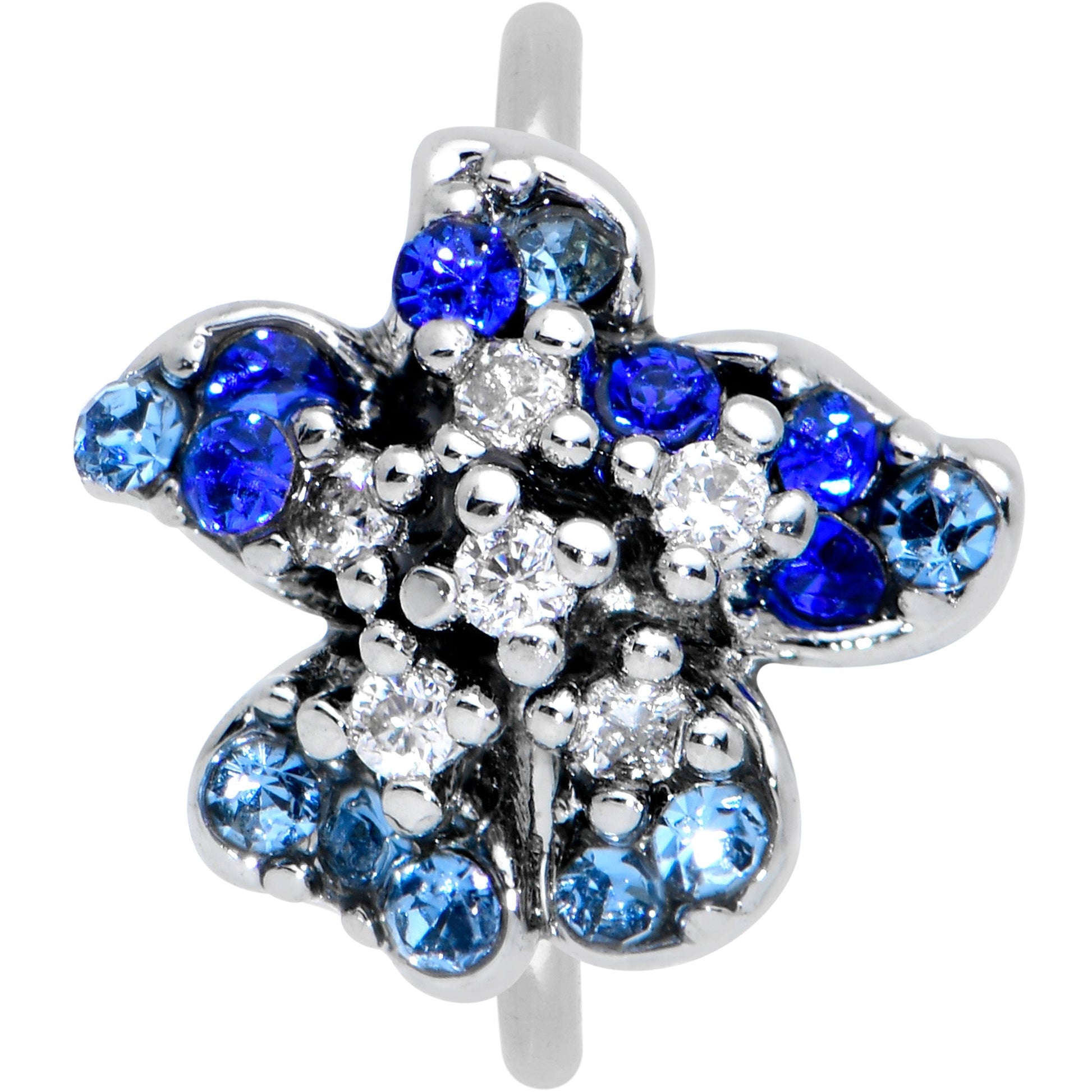 Look at the beautiful blues on this 20 gauge nostril ring! It's made with an 8mm durable 316L surgical grade stainless steel circular ring. It features an abstract flower charm. The flower is heavily set with clear and blue gems for a look that's both stylish and opulent. Let the blues bloom in your nose piercing with this fabulous floral nostril jewelry!Specifications