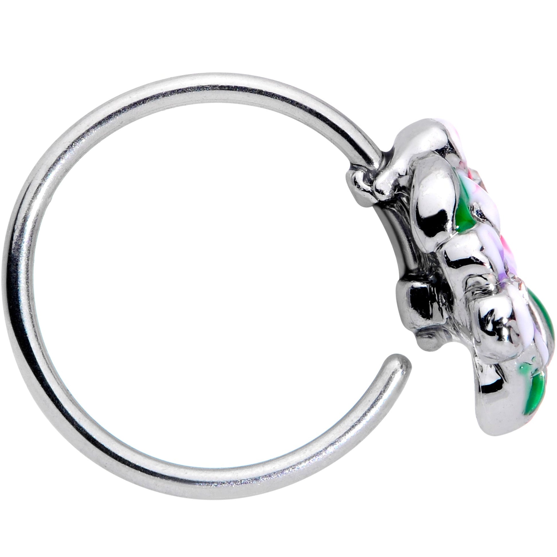 Give yourself fresh flowers every day with this 20 gauge nostril ring! It's made with an 8mm durable 316L surgical grade stainless steel circular ring. It features a two flower charm one pink and one purple, surrounded by deep green leaves and clear gem centers for a look that's cohesive and luxe. These beautiful blooms are sure to add some fabulously floral style to your nose piercing!Specifications