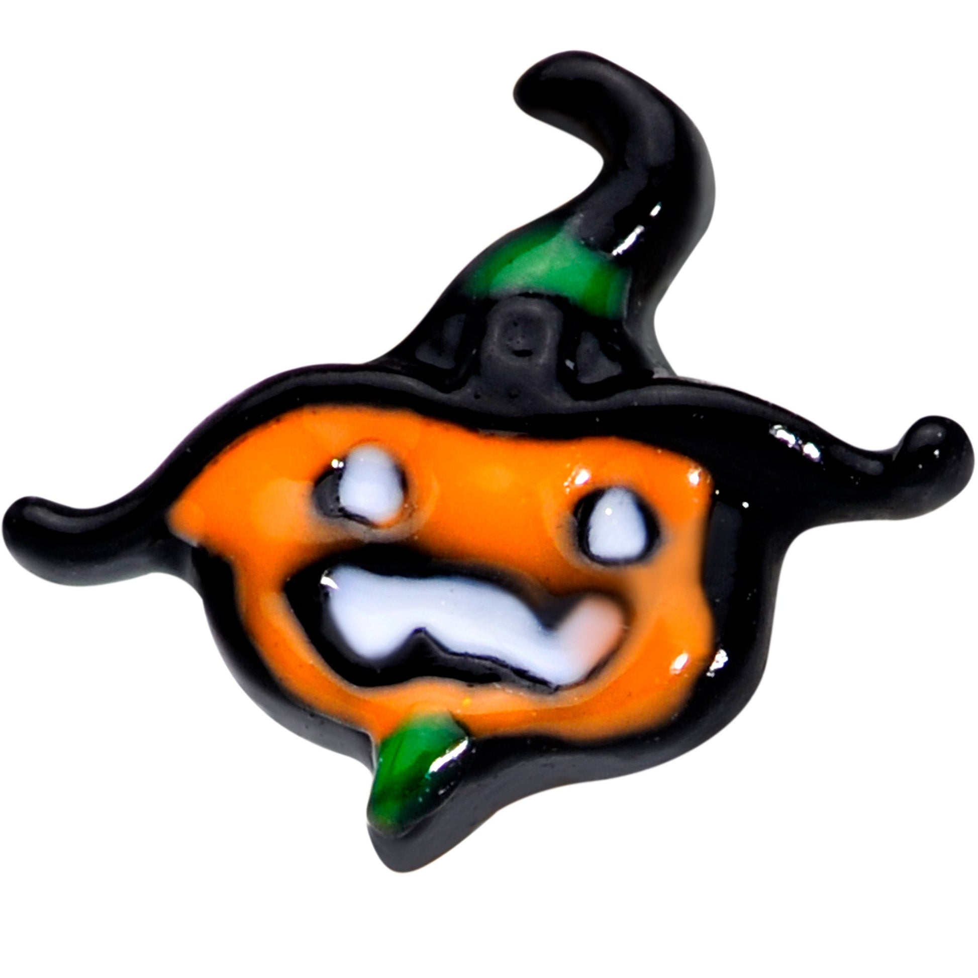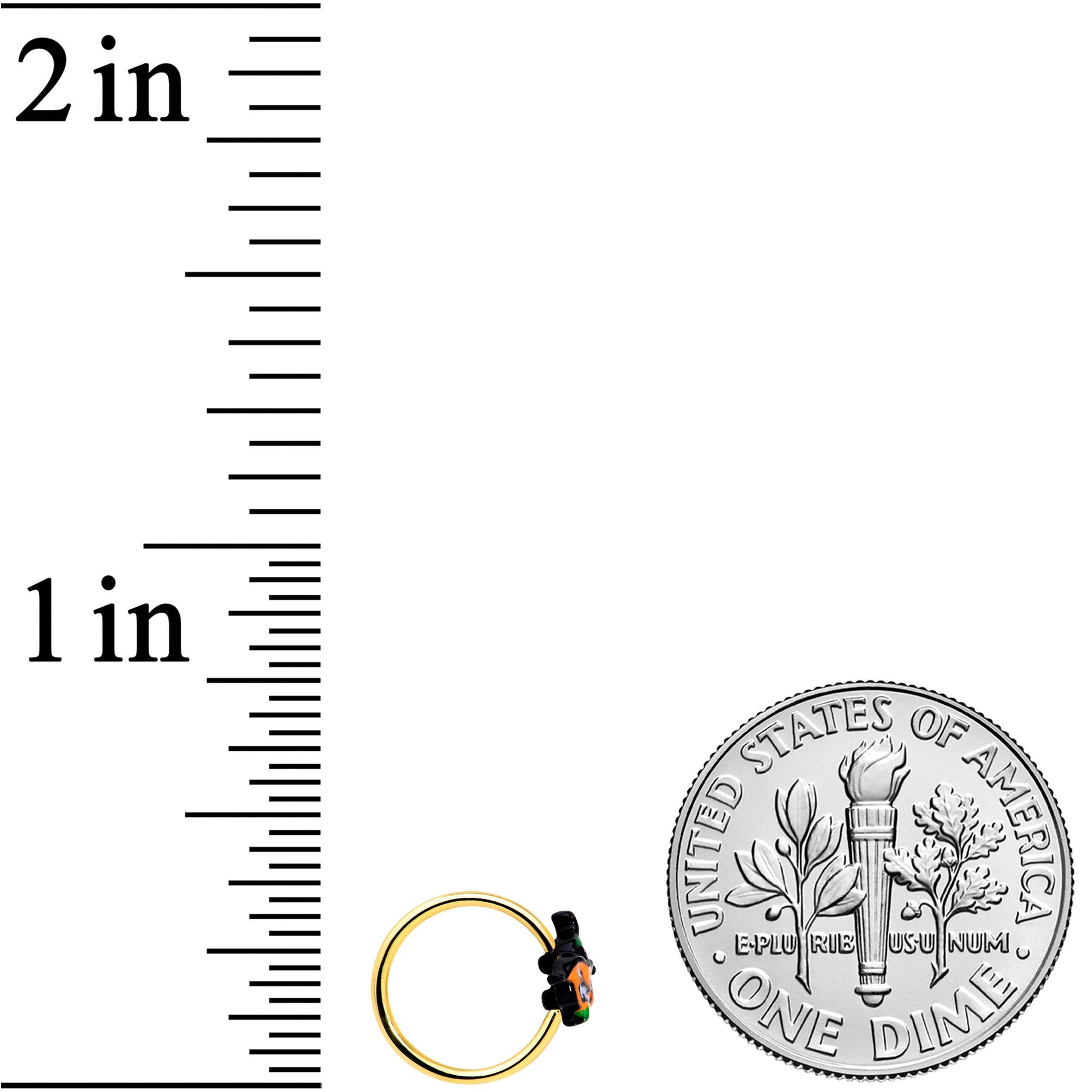 Grrrr.....the jack o'lantern on this 20 gauge nostril ring is fierce! It's made with an 8mm gold tone PVD over 316L surgical grade stainless steel circular ring. The front features a Halloween pumpkin charm, with a black witch's hat. The pumpkin is orange and its ferocious facial features are black and white for maximum visual impact. Give everyone a good scare with this spooky pumpkin nose piercing jewelry!Specifications