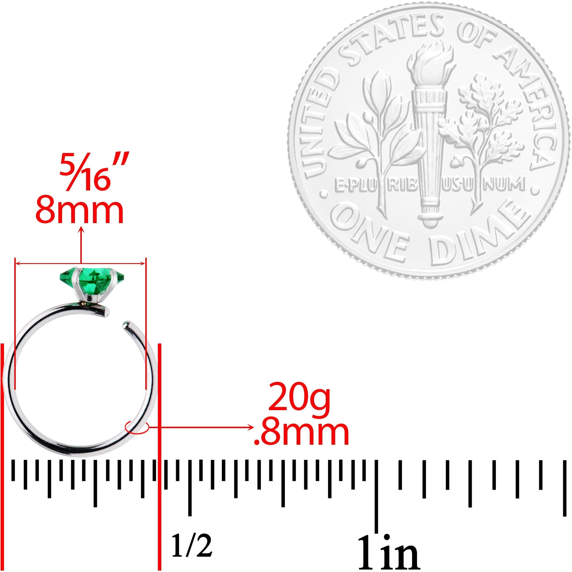 This set of 20 gauge nose rings gives you so many options you might want to get a few more nostril piercings! The 8mm hoops are made with durable 316L surgical grade stainless steel and each one features a single rhombus-shaped gem. You get one each in clear, aurora, purple, blue, green, and pink. You can match your outfit, your mood, the weather, or anything else that comes to mind! The only problem will be choosing which one to wear first! Sold as a set of six.Specifications