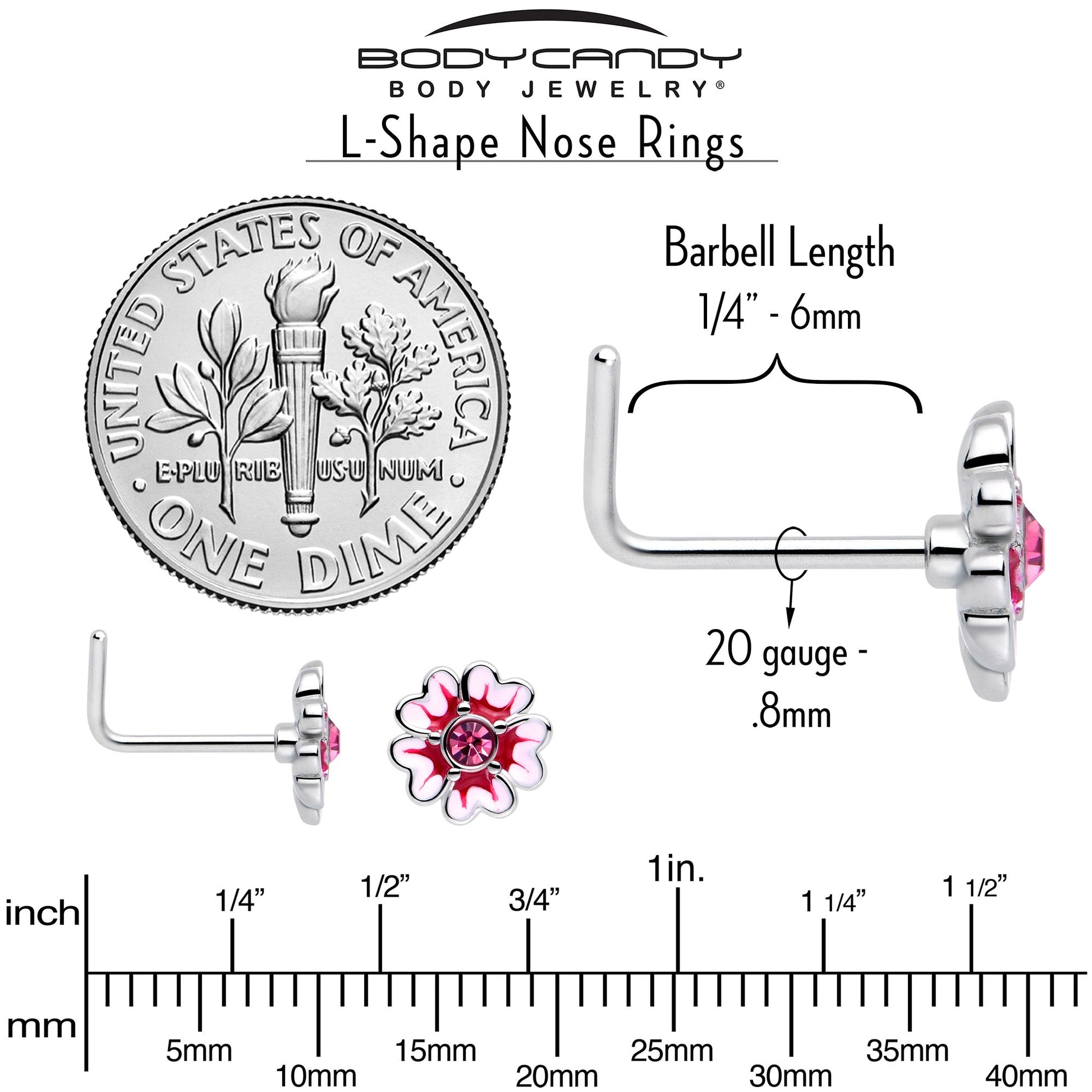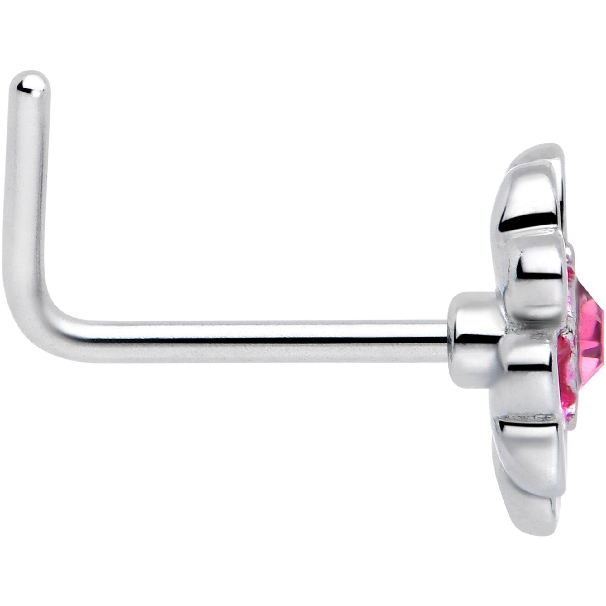 Look as perfectly pink as you could want with this 20 gauge floral nostril ring. It is made with an 8mm length at the bend 316L surgical grade stainless steel L-shaped post. It features a flower charm, inlaid in shades of pink and embellished with a pink cubic zirconia gem at the center. Get in the pink with this passionately pink floral nose piercing jewelry.Specifications
