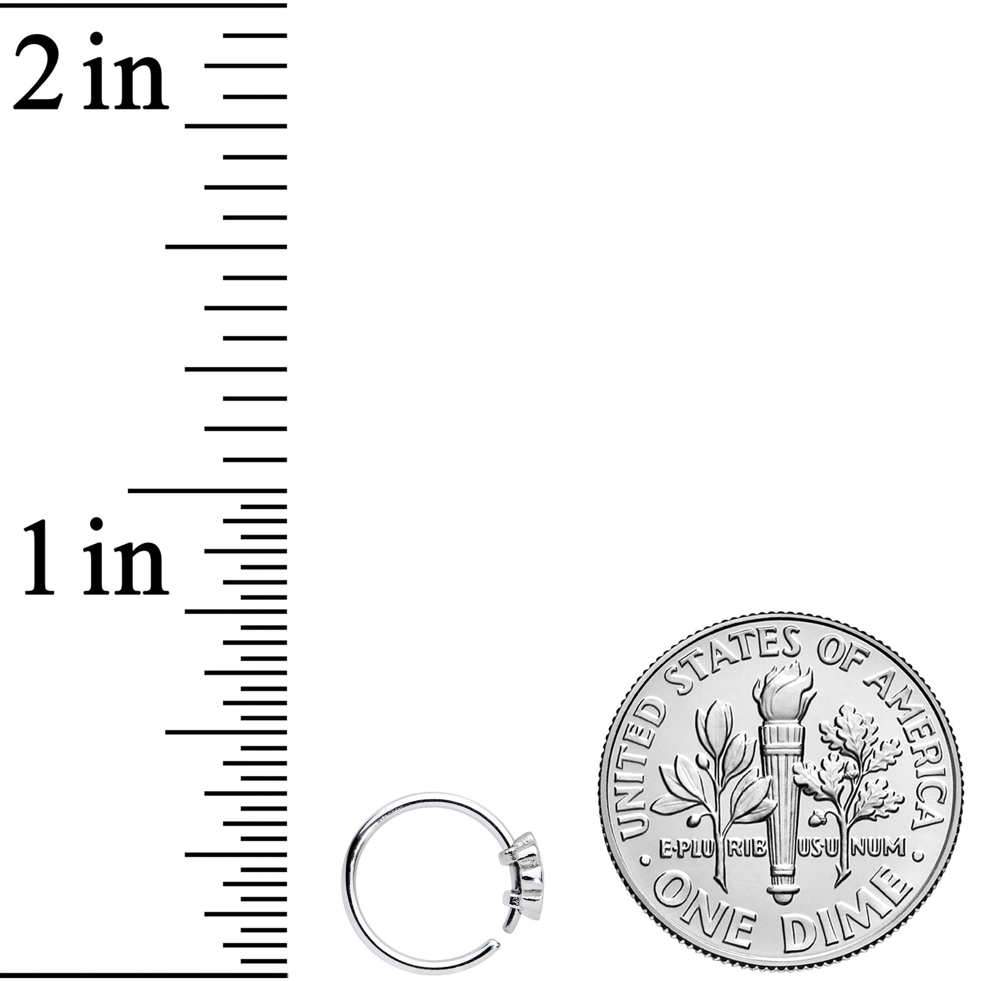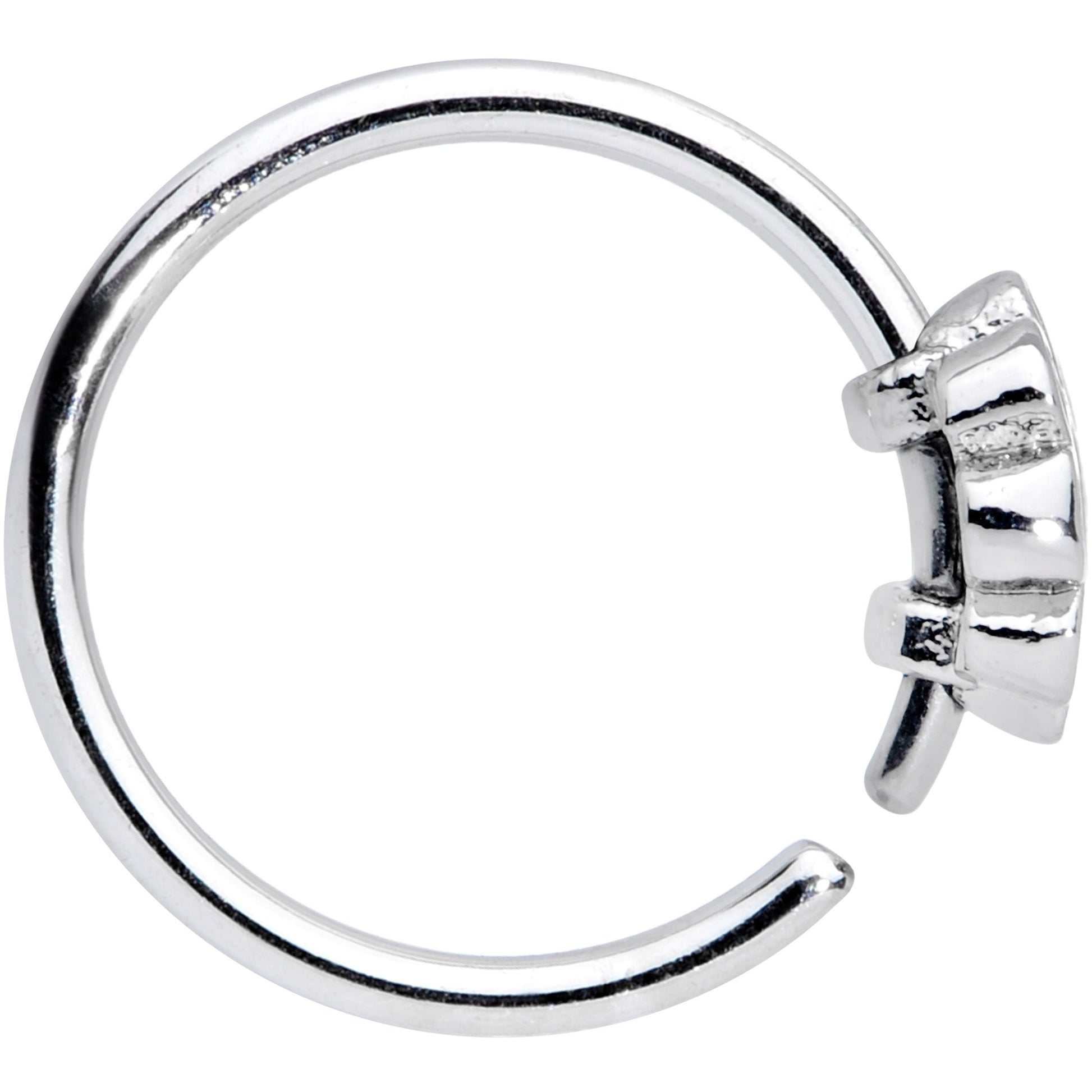 Grab your beads and your incense because this 20 gauge nostril ring is a flashback to the 1960s! It's made with an 8mm durable 316L surgical grade stainless steel circular ring and features a flower charm with each petal a different color of the rainbow, all around a cheery yellow center. To insert, just give it a light twist, insert it into your piercing and gently bend it closed. You'll be feeling the peace and love with this retro rainbow floral nose piercing jewelry!Specifications