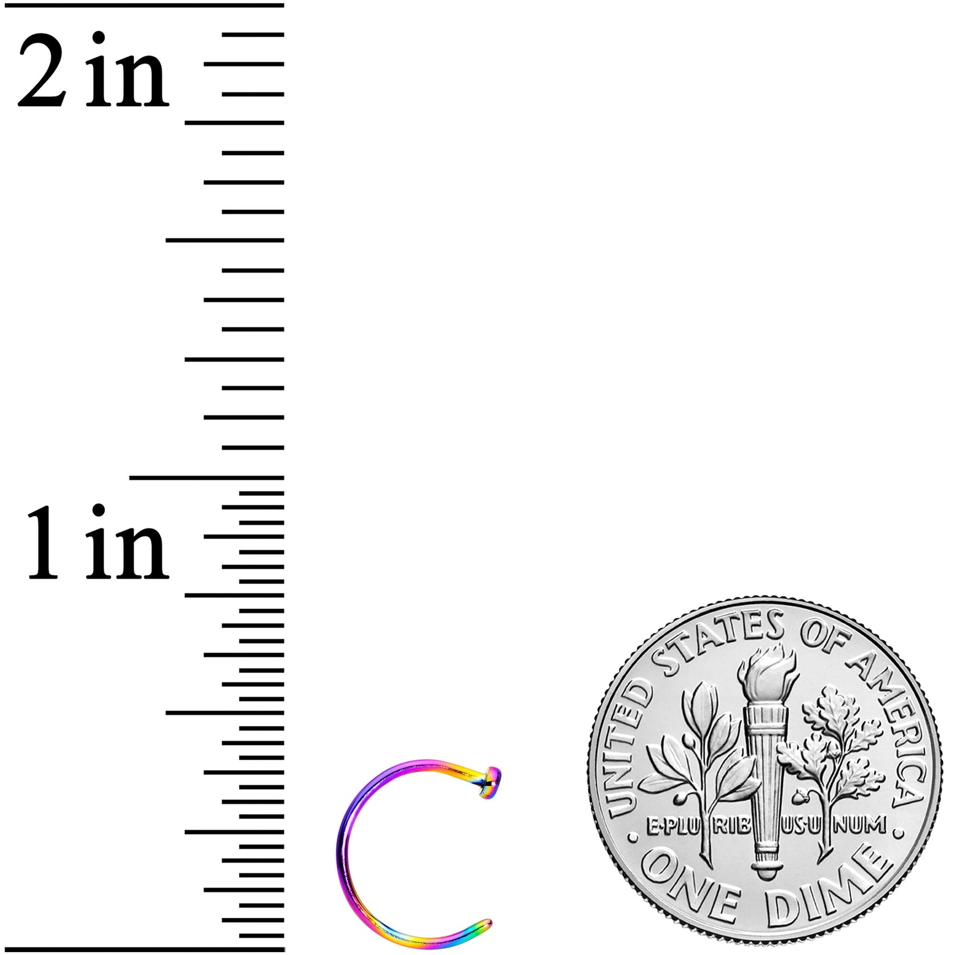 Sometimes the simple things in life are the best. Made of a rainbow PVD over solid grade 23 implant grade titanium circular ring, this 20 gauge nostril ring is built for comfort as well as serious durability. It measures 8mm length and has a flat top to rest comfortably against your nostril so you'll barely notice that it's there. Simple beauty and simple comfort mean you're going to simply love it!Specifications