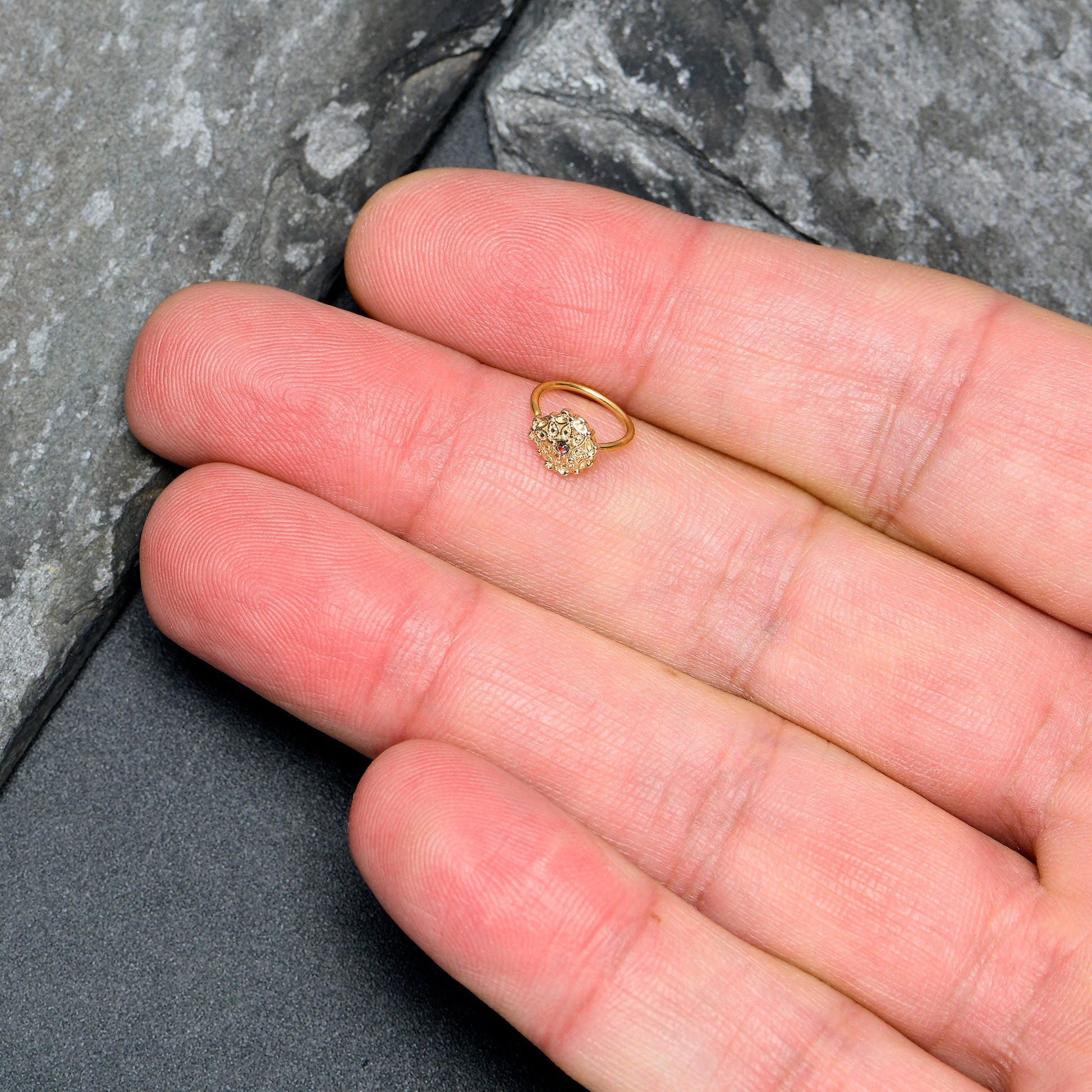 The elegant floral design on this 20 gauge nostril ring is absolutely eye-catching. It is made with an 8mm gold tone PVD over 316L surgical grade stainless steel circular ring. It features a flower charm with a vitrail gem center. It's further embellished with filigree detailing around the center. You're sure to feel gorgeous when you're rocking this elegant, floral nose piercing jewelry.Specifications