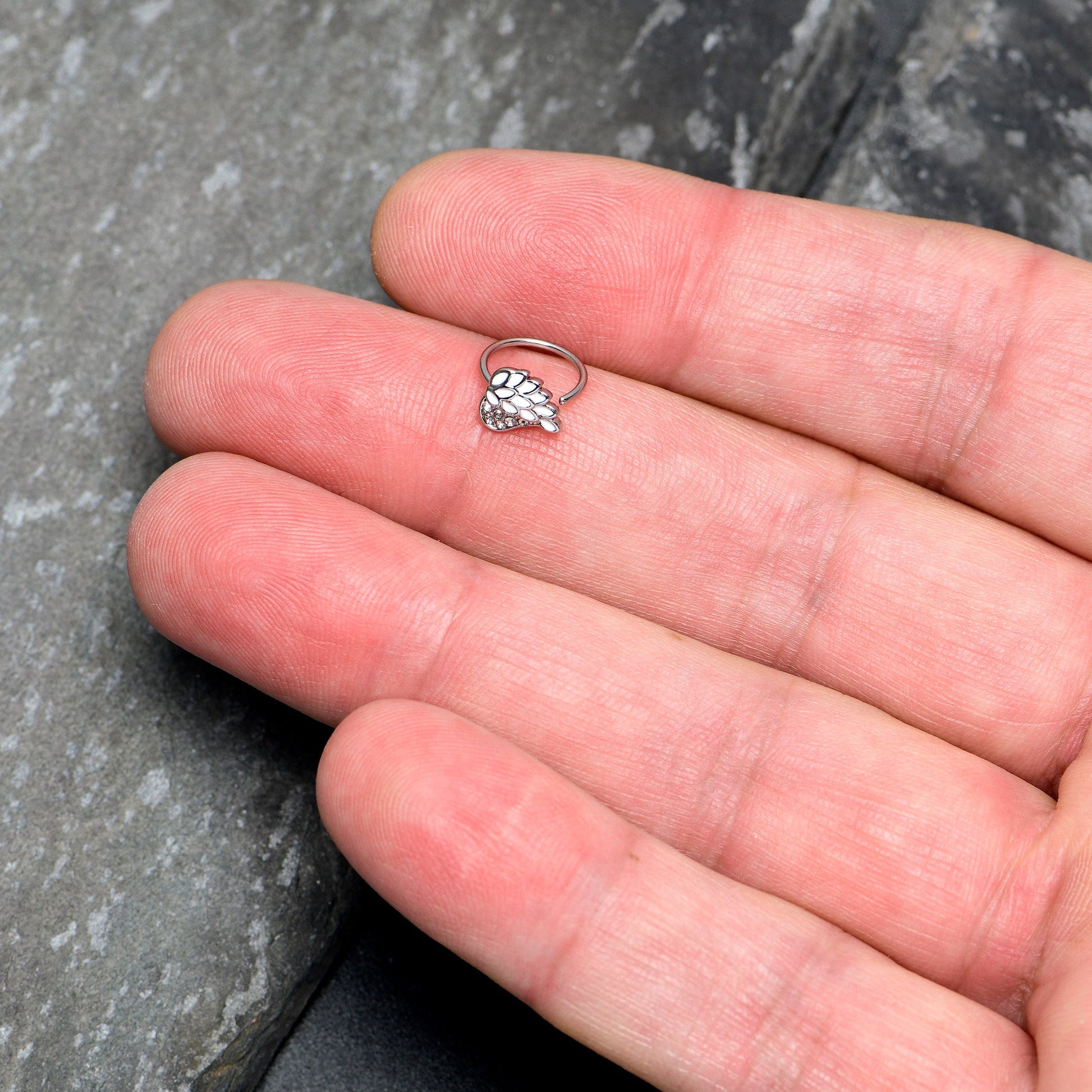 Give yourself a heavenly new look with this 20 gauge nostril ring. It's made with an 8mm durable 316L surgical grade stainless steel circular ring. It features a heart shaped charm featuring an angel's wings, with one side paved with clear gems. The other side features white inlay and simply styled feather details. Let your look and your spirit soar with this stylish and spiritual nose piercing jewelry.Specifications