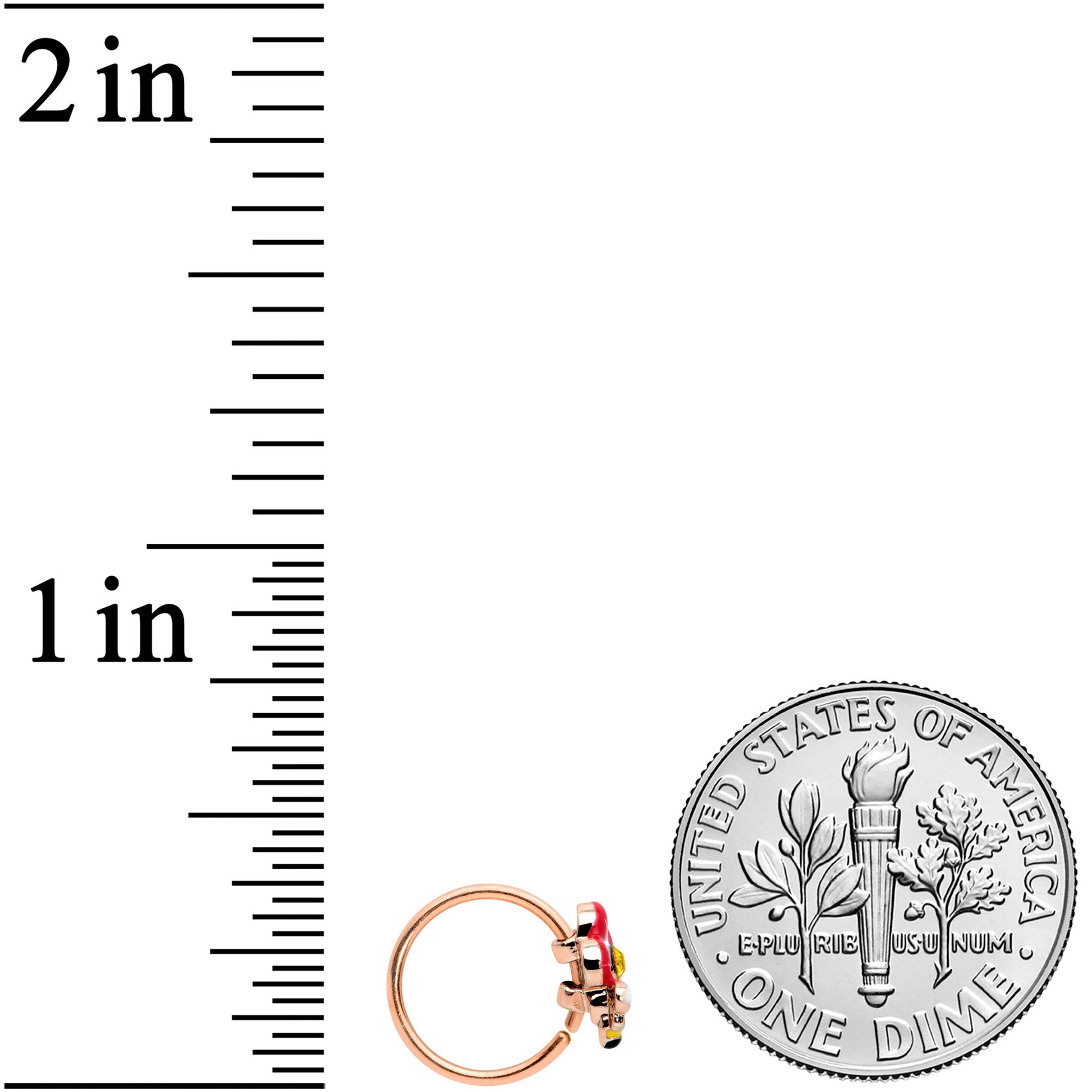 Let your nose piercing feel like a queen bee with this 20 gauge nostril ring. It's made with an 8mm rose gold tone plated over 316L surgical grade stainless steel circular ring that features a flower charm with red and white petals and a yellow gem center. The flower is embellished with a queen bee perched on it, identifiable by the red dot on her back. Feel like the queen of the hive with this charming floral nostril piercing ring!Specifications