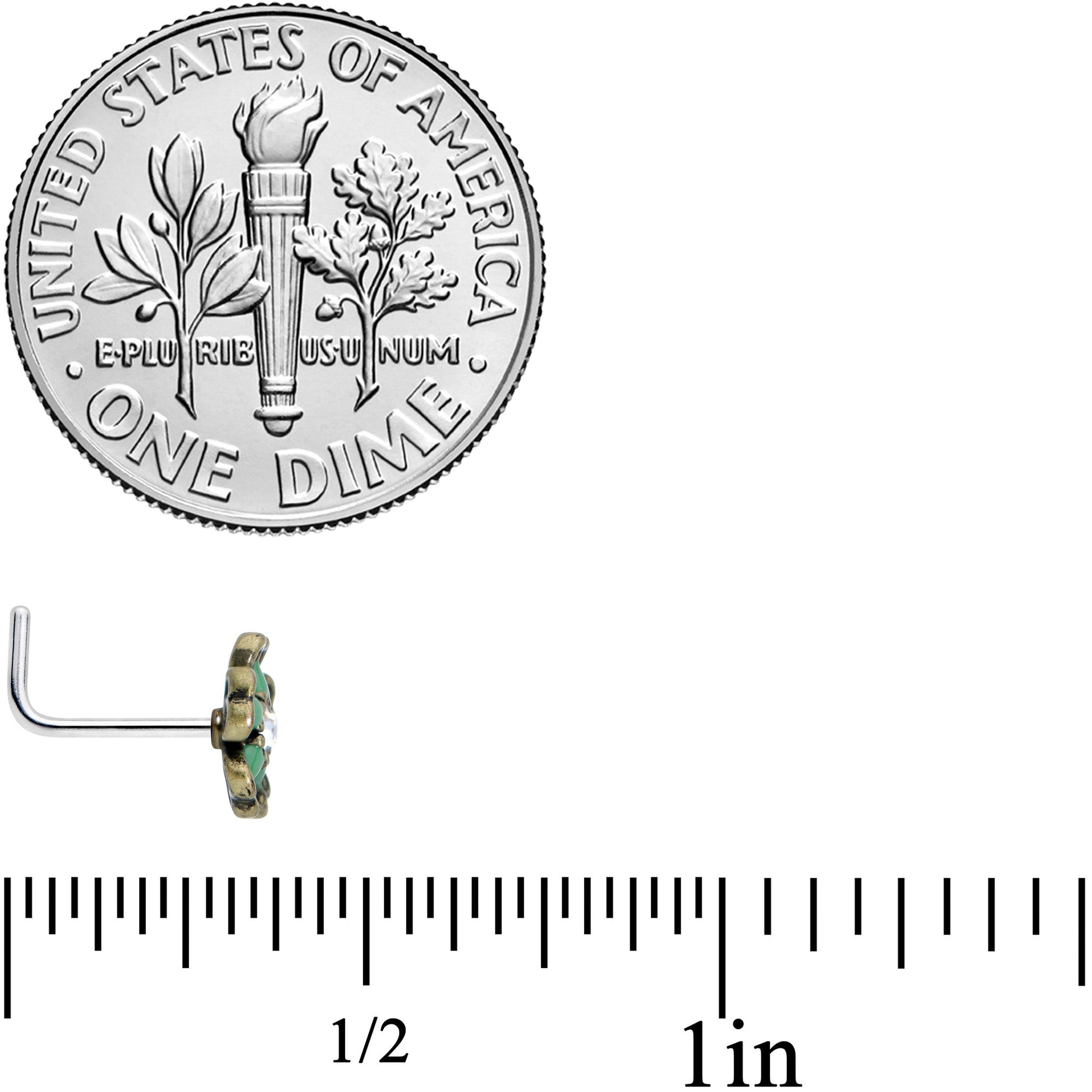 Let your look bloom in its own unique way with this 20 gauge nostril ring! It's made with a .29" length at the bend 316L surgical grade stainless steel L-shaped post. It features a flower charm with openwork petals. The petals are embellished with green orbs and it has a clear gem at the center. Rock some nostril jewelry that's as lovely and unique as you are with this fantastic flower nostril piercing ring!Specifications